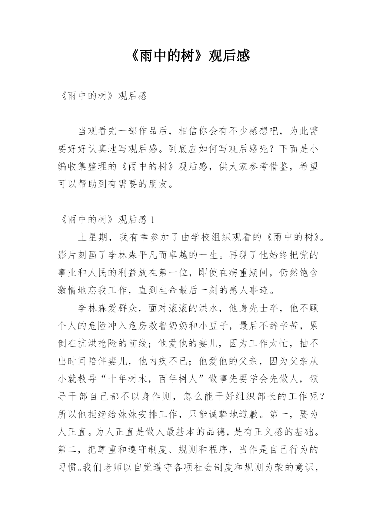 《雨中的树》观后感《雨中的树》观后感当观看完一部作品后,相信你会有不少感想吧,为此需要好好认真地写观后感。到底应如何写观后感呢?下面是小编收集整理的《雨中的树》观后感,供大家参考借鉴,希望可以帮助到有需要的朋友。《雨中的树》观后感1上星期,我有幸参加了由学校组织观看的《雨中的树》。影片刻画了李林森平凡而卓越的一生。再现了他始终把党的事业和人民的利益放在第一位,即使在病重期间,仍然饱含激情地忘我工作,直到生命最后一刻的感人事迹。李林森爱群众,面对滚滚的洪水,他身先士卒,他不顾个人的危险冲入危房救鲁奶奶和小豆