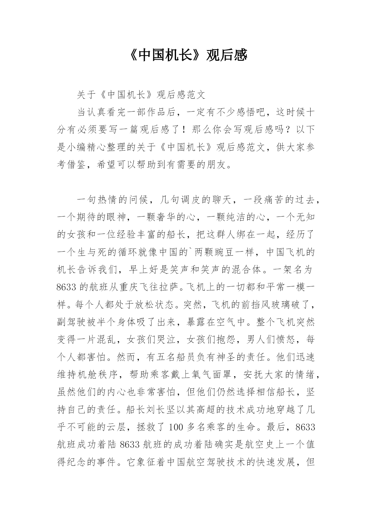《中国机长》观后感关于《中国机长》观后感范文当认真看完一部作品后,一定有不少感悟吧,这时候十分有必须要写一篇观后感了!那么你会写观后感吗?以下是小编精心整理的关于《中国机长》观后感范文,供大家参考借鉴,希望可以帮助到有需要的朋友。一句热情的问候,几句调皮的聊天,一段痛苦的过去,一个期待的眼神,一颗奢华的心,一颗纯洁的心,一个无知的女孩和一位经验丰富的船长,把这群人绑在一起,经历了一个生与死的循环就像中国的`两颗豌豆一样,中国飞机的机长告诉我们,早上好是笑声和笑声的混合体。一架名为8633的航班从重庆飞往拉