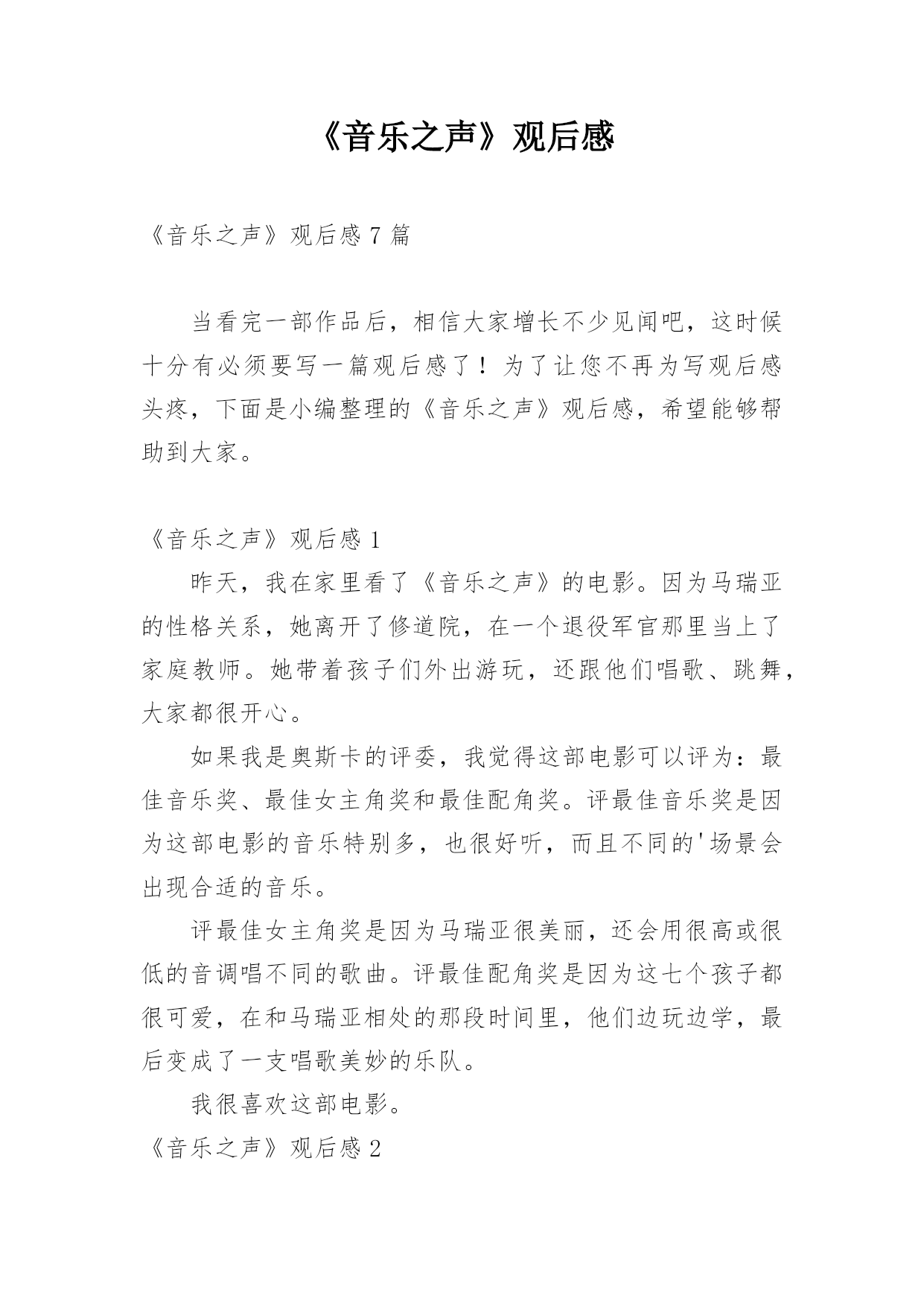 《音乐之声》观后感《音乐之声》观后感7篇当看完一部作品后,相信大家增长不少见闻吧,这时候十分有必须要写一篇观后感了!为了让您不再为写观后感头疼,下面是小编整理的《音乐之声》观后感,希望能够帮助到大家。《音乐之声》观后感1昨天,我在家里看了《音乐之声》的电影。因为马瑞亚的性格关系,她离开了修道院,在一个退役军官那里当上了家庭教师。她带着孩子们外出游玩,还跟他们唱歌、跳舞,大家都很开心。如果我是奥斯卡的评委,我觉得这部电影可以评为:最佳音乐奖、最佳女主角奖和最佳配角奖。评最佳音乐奖是因为这部电影的音乐特别多,