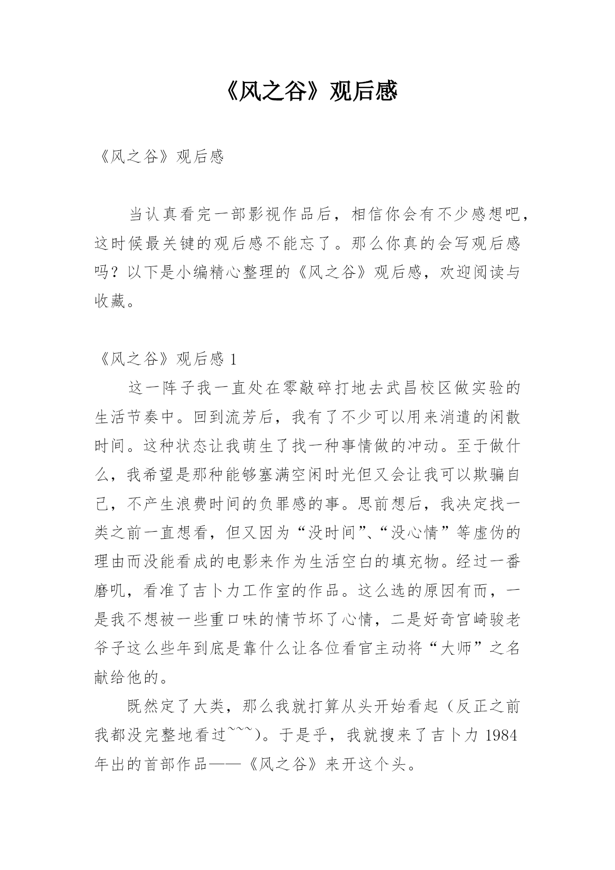 《风之谷》观后感《风之谷》观后感当认真看完一部影视作品后,相信你会有不少感想吧,这时候最关键的观后感不能忘了。那么你真的会写观后感吗?以下是小编精心整理的《风之谷》观后感,欢迎阅读与收藏。《风之谷》观后感1这一阵子我一直处在零敲碎打地去武昌校区做实验的生活节奏中。回到流芳后,我有了不少可以用来消遣的闲散时间。这种状态让我萌生了找一种事情做的冲动。至于做什么,我希望是那种能够塞满空闲时光但又会让我可以欺骗自己,不产生浪费时间的负罪感的事。思前想后,我决定找一类之前一直想看,但又因为“没时间”、“没心情”等虚