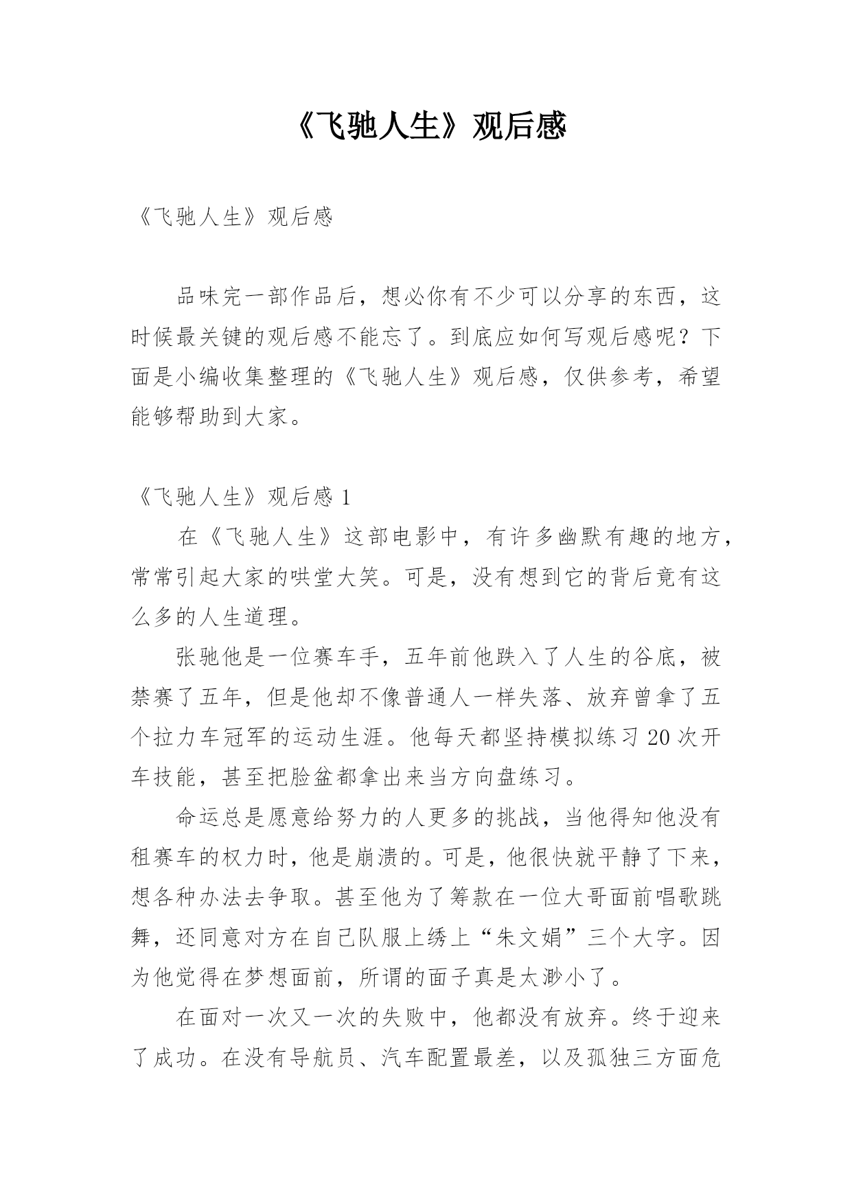 《飞驰人生》观后感《飞驰人生》观后感品味完一部作品后,想必你有不少可以分享的东西,这时候最关键的观后感不能忘了。到底应如何写观后感呢?下面是小编收集整理的《飞驰人生》观后感,仅供参考,希望能够帮助到大家。《飞驰人生》观后感1在《飞驰人生》这部电影中,有许多幽默有趣的地方,常常引起大家的哄堂大笑。可是,没有想到它的背后竟有这么多的人生道理。张驰他是一位赛车手,五年前他跌入了人生的谷底,被禁赛了五年,但是他却不像普通人一样失落、放弃曾拿了五个拉力车冠军的运动生涯。他每天都坚持模拟练习20次开车技能,甚至把脸盆