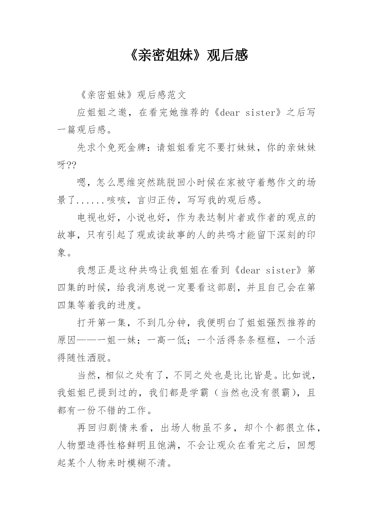 《亲密姐妹》观后感《亲密姐妹》观后感范文应姐姐之邀,在看完她推荐的《dearsister》之后写一篇观后感。先求个免死金牌:请姐姐看完不要打妹妹,你的亲妹妹呀??嗯,怎么思维突然跳脱回小时候在家被守着憋作文的场景了......咳咳,言归正传,写写我的观后感。电视也好,小说也好,作为表达制片者或作者的观点的故事,只有引起了观或读故事的人的共鸣才能留下深刻的印象。我想正是这种共鸣让我姐姐在看到《dearsister》第四集的时候,给我消息说一定要看这部剧,并且自己会在第四集等着我的进度。打开第一集,不到几分钟