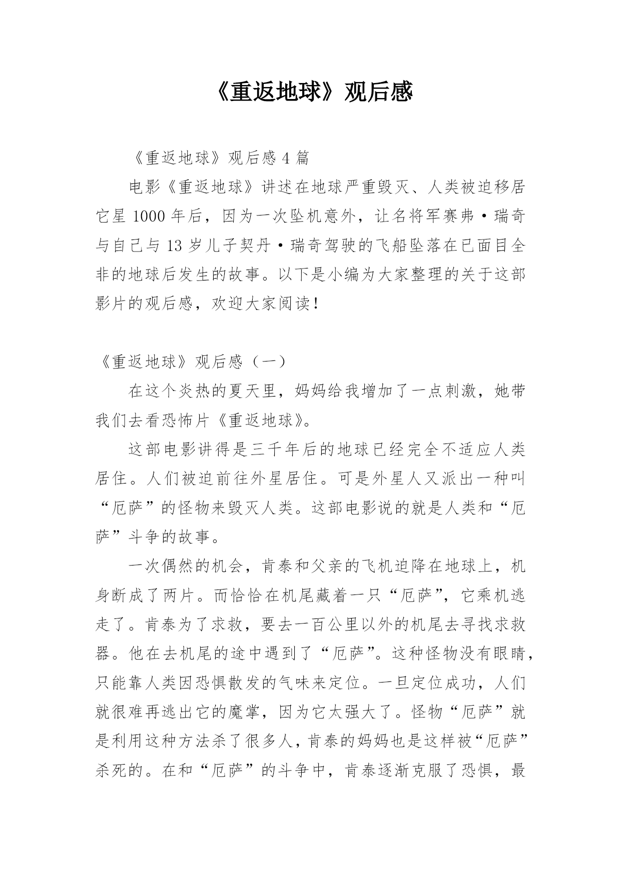 《重返地球》观后感《重返地球》观后感4篇电影《重返地球》讲述在地球严重毁灭、人类被迫移居它星1000年后,因为一次坠机意外,让名将军赛弗·瑞奇与自己与13岁儿子契丹·瑞奇驾驶的飞船坠落在已面目全非的地球后发生的故事。以下是小编为大家整理的关于这部影片的观后感,欢迎大家阅读!《重返地球》观后感(一)在这个炎热的夏天里,妈妈给我增加了一点刺激,她带我们去看恐怖片《重返地球》。这部电影讲得是三千年后的地球已经完全不适应人类居住。人们被迫前往外星居住。可是外星人又派出一种叫“厄萨”的怪物来毁灭人类。这部电影说的就