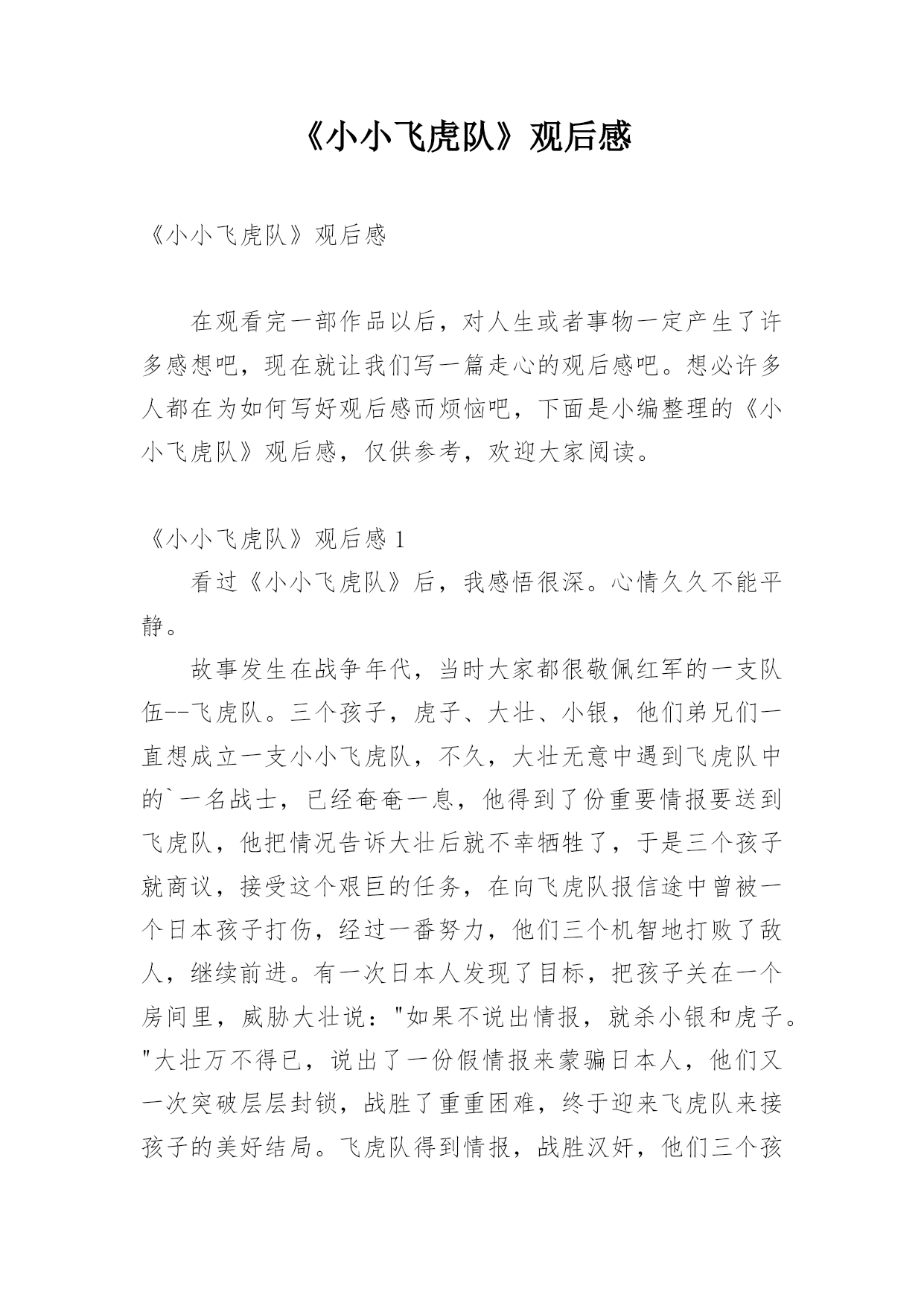 《小小飞虎队》观后感《小小飞虎队》观后感在观看完一部作品以后,对人生或者事物一定产生了许多感想吧,现在就让我们写一篇走心的观后感吧。想必许多人都在为如何写好观后感而烦恼吧,下面是小编整理的《小小飞虎队》观后感,仅供参考,欢迎大家阅读。《小小飞虎队》观后感1看过《小小飞虎队》后,我感悟很深。心情久久不能平静。故事发生在战争年代,当时大家都很敬佩红军的一支队伍--飞虎队。三个孩子,虎子、大壮、小银,他们弟兄们一直想成立一支小小飞虎队,不久,大壮无意中遇到飞虎队中的`一名战士,已经奄奄一息,他得到了份重要情报要