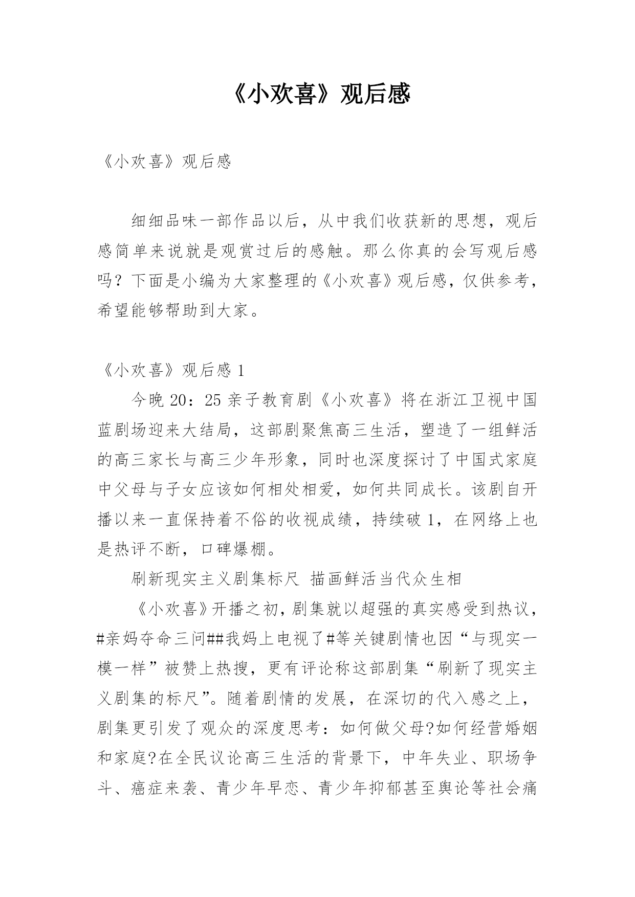 《小欢喜》观后感《小欢喜》观后感细细品味一部作品以后,从中我们收获新的思想,观后感简单来说就是观赏过后的感触。那么你真的会写观后感吗?下面是小编为大家整理的《小欢喜》观后感,仅供参考,希望能够帮助到大家。《小欢喜》观后感1今晚20:25亲子教育剧《小欢喜》将在浙江卫视中国蓝剧场迎来大结局,这部剧聚焦高三生活,塑造了一组鲜活的高三家长与高三少年形象,同时也深度探讨了中国式家庭中父母与子女应该如何相处相爱,如何共同成长。该剧自开播以来一直保持着不俗的收视成绩,持续破1,在网络上也是热评不断,口碑爆棚。刷新现实