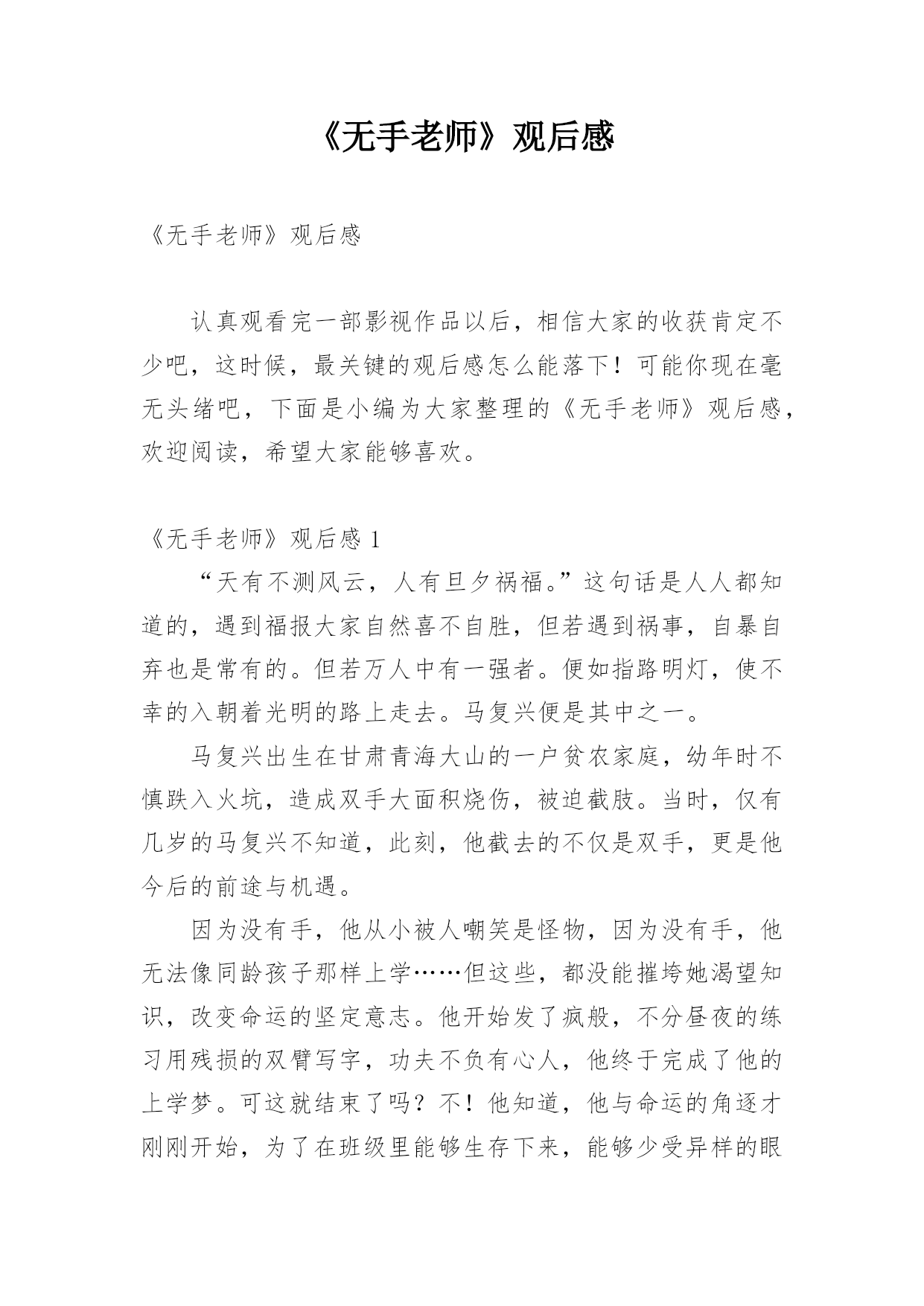 《无手老师》观后感《无手老师》观后感认真观看完一部影视作品以后,相信大家的收获肯定不少吧,这时候,最关键的观后感怎么能落下!可能你现在毫无头绪吧,下面是小编为大家整理的《无手老师》观后感,欢迎阅读,希望大家能够喜欢。《无手老师》观后感1“天有不测风云,人有旦夕祸福。”这句话是人人都知道的,遇到福报大家自然喜不自胜,但若遇到祸事,自暴自弃也是常有的。但若万人中有一强者。便如指路明灯,使不幸的入朝着光明的路上走去。马复兴便是其中之一。马复兴出生在甘肃青海大山的一户贫农家庭,幼年时不慎跌入火坑,造成双手大面积烧