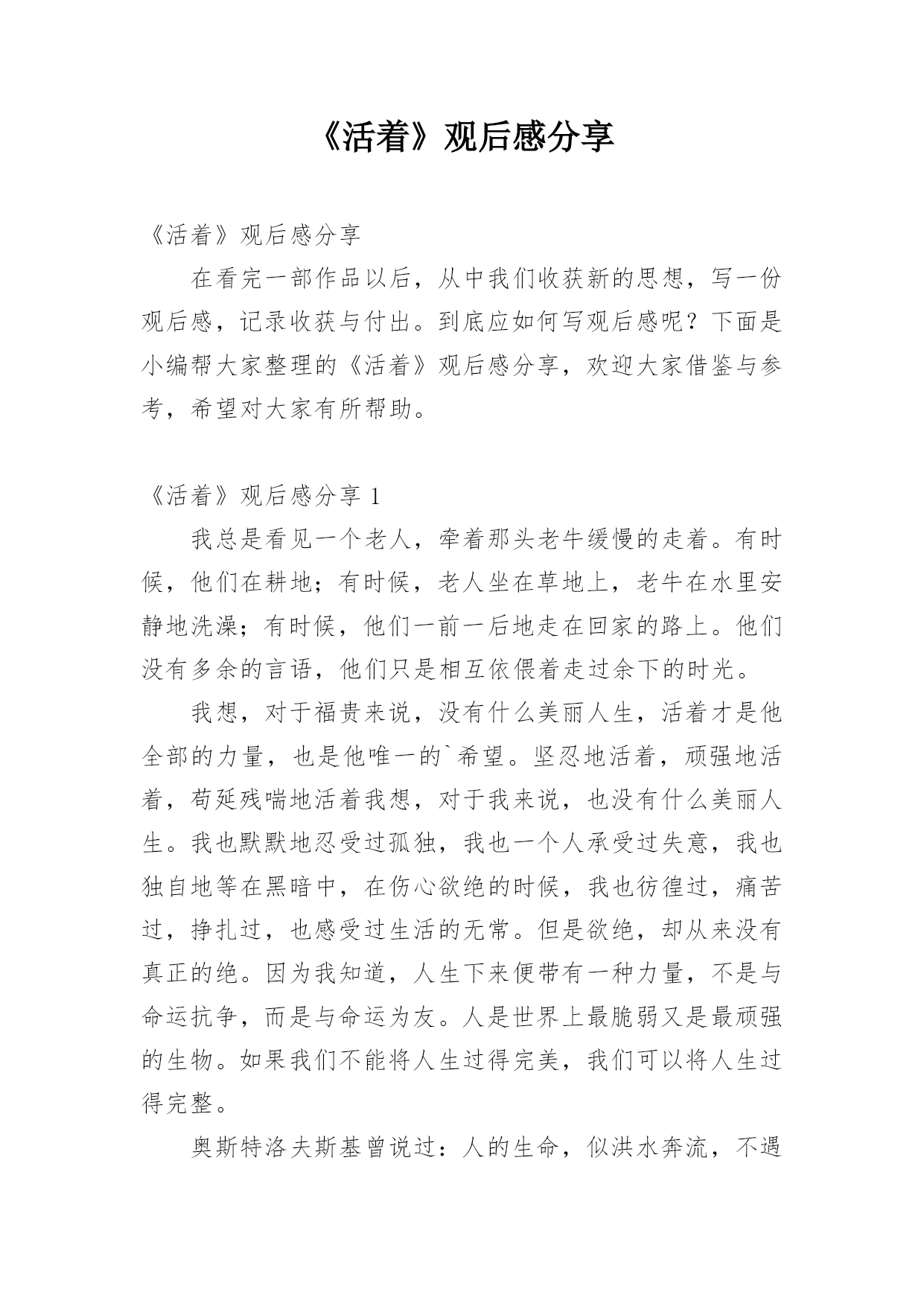 《活着》观后感分享《活着》观后感分享在看完一部作品以后,从中我们收获新的思想,写一份观后感,记录收获与付出。到底应如何写观后感呢?下面是小编帮大家整理的《活着》观后感分享,欢迎大家借鉴与参考,希望对大家有所帮助。《活着》观后感分享1我总是看见一个老人,牵着那头老牛缓慢的走着。有时候,他们在耕地;有时候,老人坐在草地上,老牛在水里安静地洗澡;有时候,他们一前一后地走在回家的路上。他们没有多余的言语,他们只是相互依偎着走过余下的时光。我想,对于福贵来说,没有什么美丽人生,活着才是他全部的力量,也是他唯一的`希