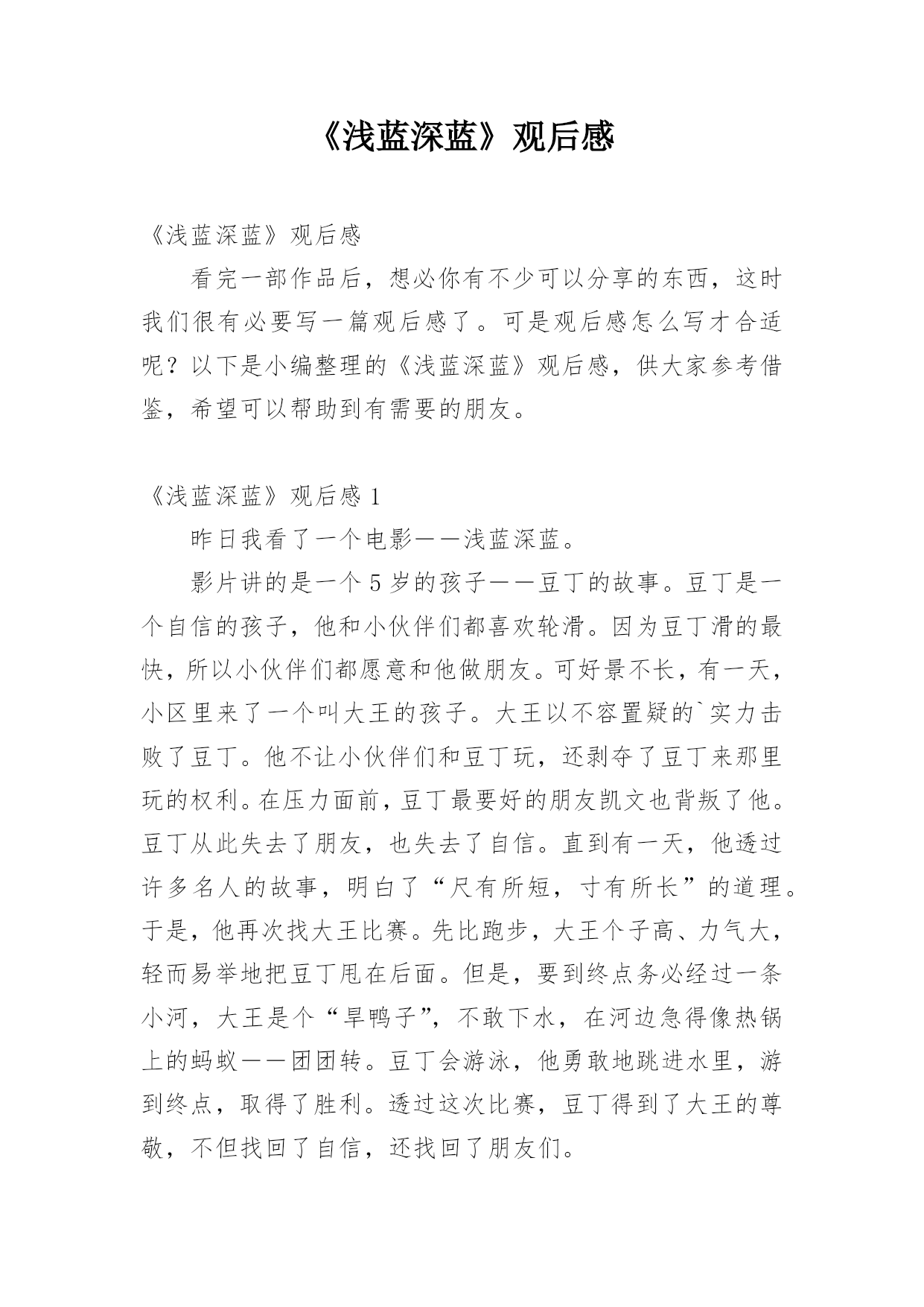 《浅蓝深蓝》观后感《浅蓝深蓝》观后感看完一部作品后,想必你有不少可以分享的东西,这时我们很有必要写一篇观后感了。可是观后感怎么写才合适呢?以下是小编整理的《浅蓝深蓝》观后感,供大家参考借鉴,希望可以帮助到有需要的朋友。《浅蓝深蓝》观后感1昨日我看了一个电影――浅蓝深蓝。影片讲的是一个5岁的孩子――豆丁的故事。豆丁是一个自信的孩子,他和小伙伴们都喜欢轮滑。因为豆丁滑的最快,所以小伙伴们都愿意和他做朋友。可好景不长,有一天,小区里来了一个叫大王的孩子。大王以不容置疑的`实力击败了豆丁。他不让小伙伴们和豆丁玩,