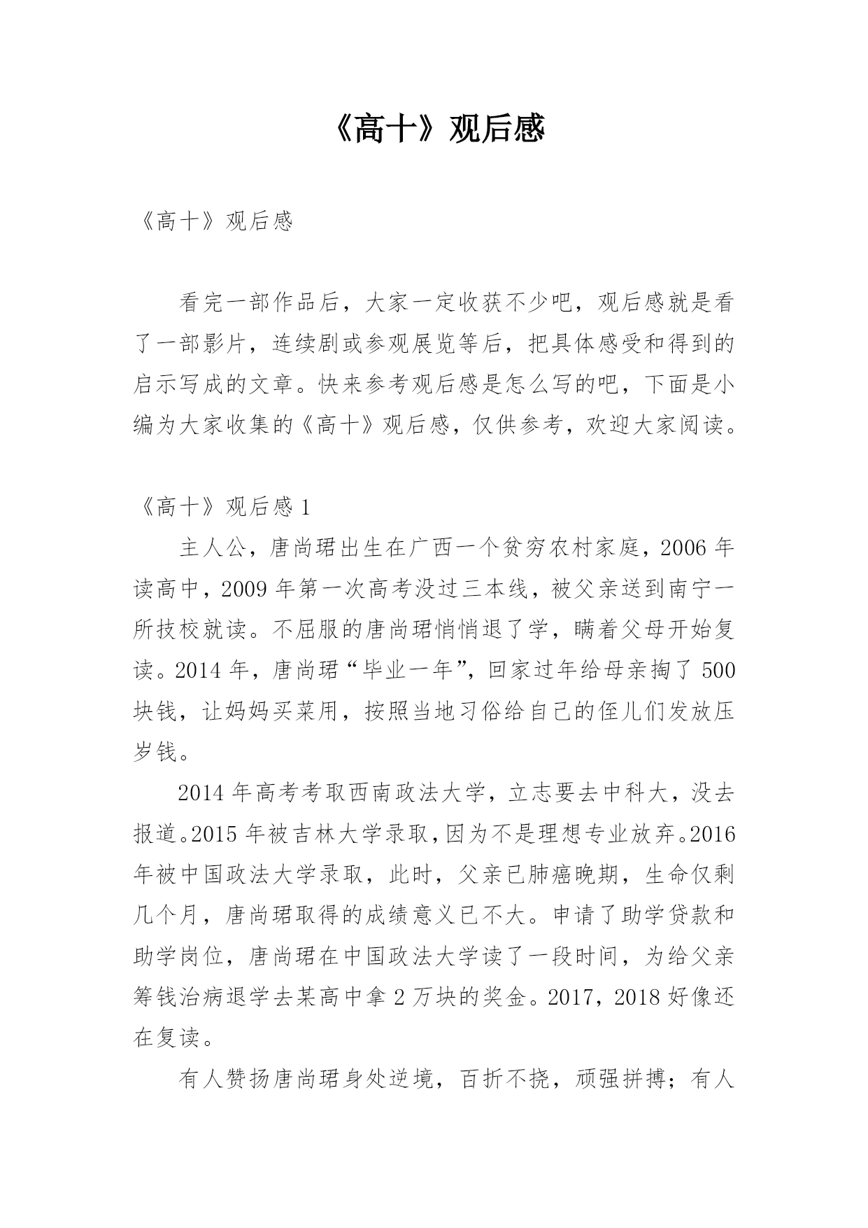 《高十》观后感《高十》观后感看完一部作品后,大家一定收获不少吧,观后感就是看了一部影片,连续剧或参观展览等后,把具体感受和得到的启示写成的文章。快来参考观后感是怎么写的吧,下面是小编为大家收集的《高十》观后感,仅供参考,欢迎大家阅读。《高十》观后感1主人公,唐尚珺出生在广西一个贫穷农村家庭,2006年读高中,2009年第一次高考没过三本线,被父亲送到南宁一所技校就读。不屈服的唐尚珺悄悄退了学,瞒着父母开始复读。2014年,唐尚珺“毕业一年”,回家过年给母亲掏了500块钱,让妈妈买菜用,按照当地习俗给自己的