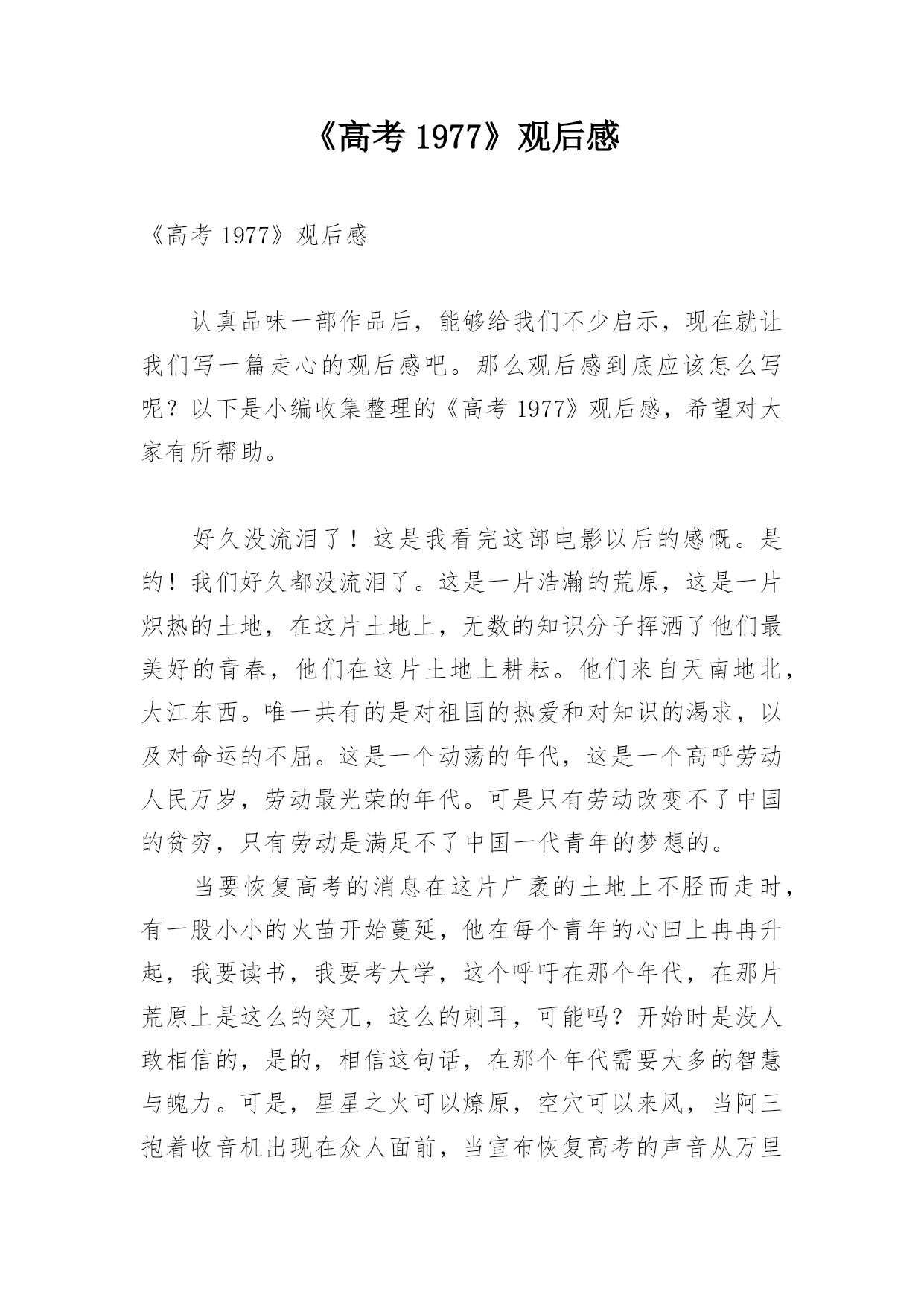 《高考1977》观后感《高考1977》观后感认真品味一部作品后,能够给我们不少启示,现在就让我们写一篇走心的观后感吧。那么观后感到底应该怎么写呢?以下是小编收集整理的《高考1977》观后感,希望对大家有所帮助。好久没流泪了!这是我看完这部电影以后的感慨。是的!我们好久都没流泪了。这是一片浩瀚的荒原,这是一片炽热的土地,在这片土地上,无数的知识分子挥洒了他们最美好的青春,他们在这片土地上耕耘。他们来自天南地北,大江东西。唯一共有的是对祖国的热爱和对知识的渴求,以及对命运的不屈。这是一个动荡的年代,这是一个高