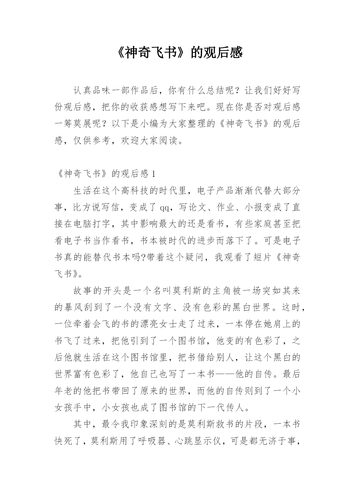 《神奇飞书》的观后感认真品味一部作品后,你有什么总结呢?让我们好好写份观后感,把你的收获感想写下来吧。现在你是否对观后感一筹莫展呢?以下是小编为大家整理的《神奇飞书》的观后感,仅供参考,欢迎大家阅读。《神奇飞书》的观后感1生活在这个高科技的时代里,电子产品渐渐代替大部分事,比方说写信,变成了qq,写论文、作业、小报变成了直接在电脑打字,其中影响最大的还是看书,有些家庭甚至把看电子书当作看书,书本被时代的进步而落下了。可是电子书真的能替代书本吗?带着这个疑问,我观看了短片《神奇飞书》。故事的开头是一个名叫莫
