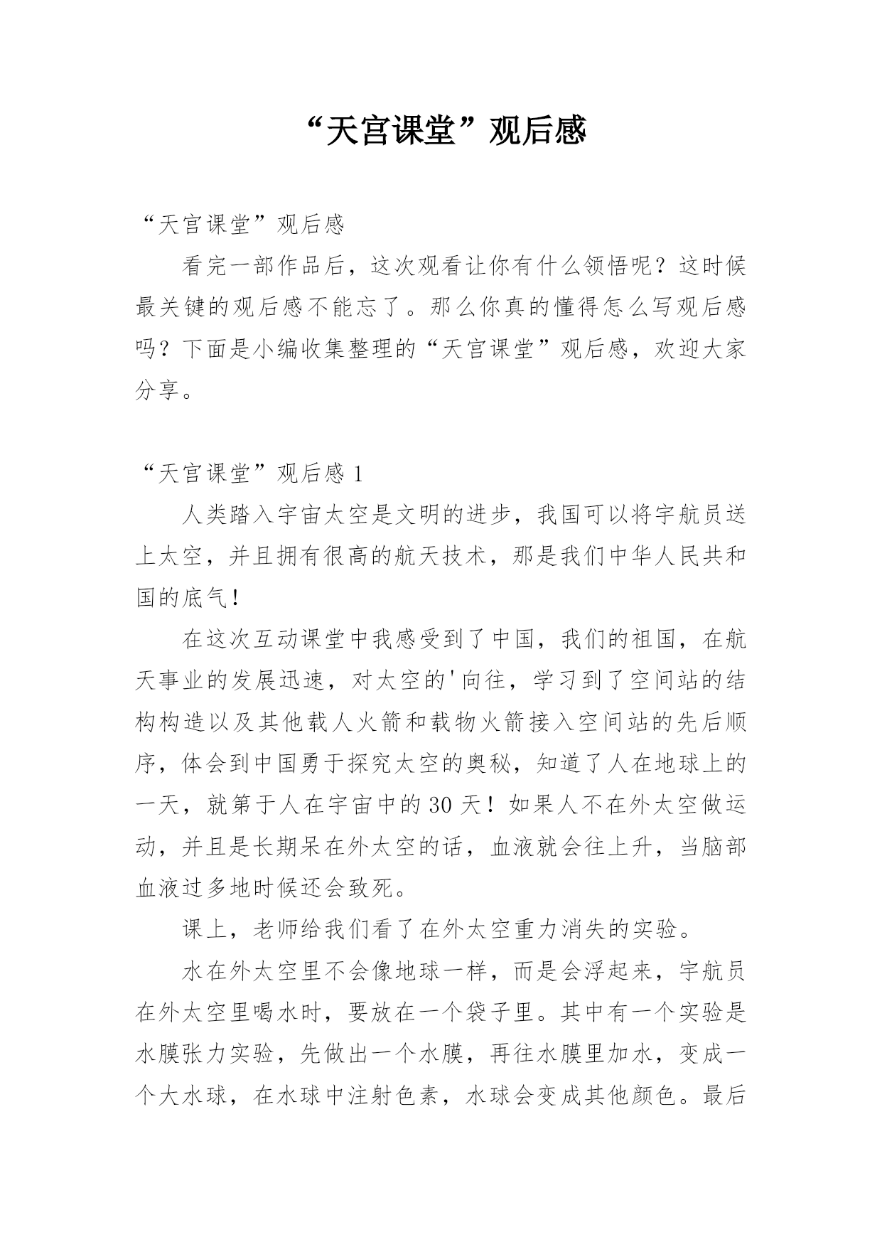 “天宫课堂”观后感“天宫课堂”观后感看完一部作品后,这次观看让你有什么领悟呢?这时候最关键的观后感不能忘了。那么你真的懂得怎么写观后感吗?下面是小编收集整理的“天宫课堂”观后感,欢迎大家分享。“天宫课堂”观后感1人类踏入宇宙太空是文明的进步,我国可以将宇航员送上太空,并且拥有很高的航天技术,那是我们中华人民共和国的底气!在这次互动课堂中我感受到了中国,我们的祖国,在航天事业的发展迅速,对太空的'向往,学习到了空间站的结构构造以及其他载人火箭和载物火箭接入空间站的先后顺序,体会到中国勇于探究太空的奥秘,知道