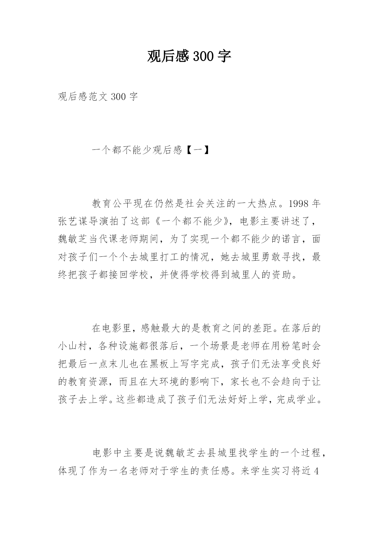 观后感300字观后感范文300字一个都不能少观后感【一】教育公平现在仍然是社会关注的一大热点。1998年张艺谋导演拍了这部《一个都不能少》,电影主要讲述了,魏敏芝当代课老师期间,为了实现一个都不能少的诺言,面对孩子们一个个去城里打工的情况,她去城里勇敢寻找,最终把孩子都接回学校,并使得学校得到城里人的资助。在电影里,感触最大的是教育之间的差距。在落后的小山村,各种设施都很落后,一个场景是老师在用粉笔时会把最后一点末儿也在黑板上写字完成,孩子们无法享受良好的教育资源,而且在大环境的影响下,家长也不会趋向于让