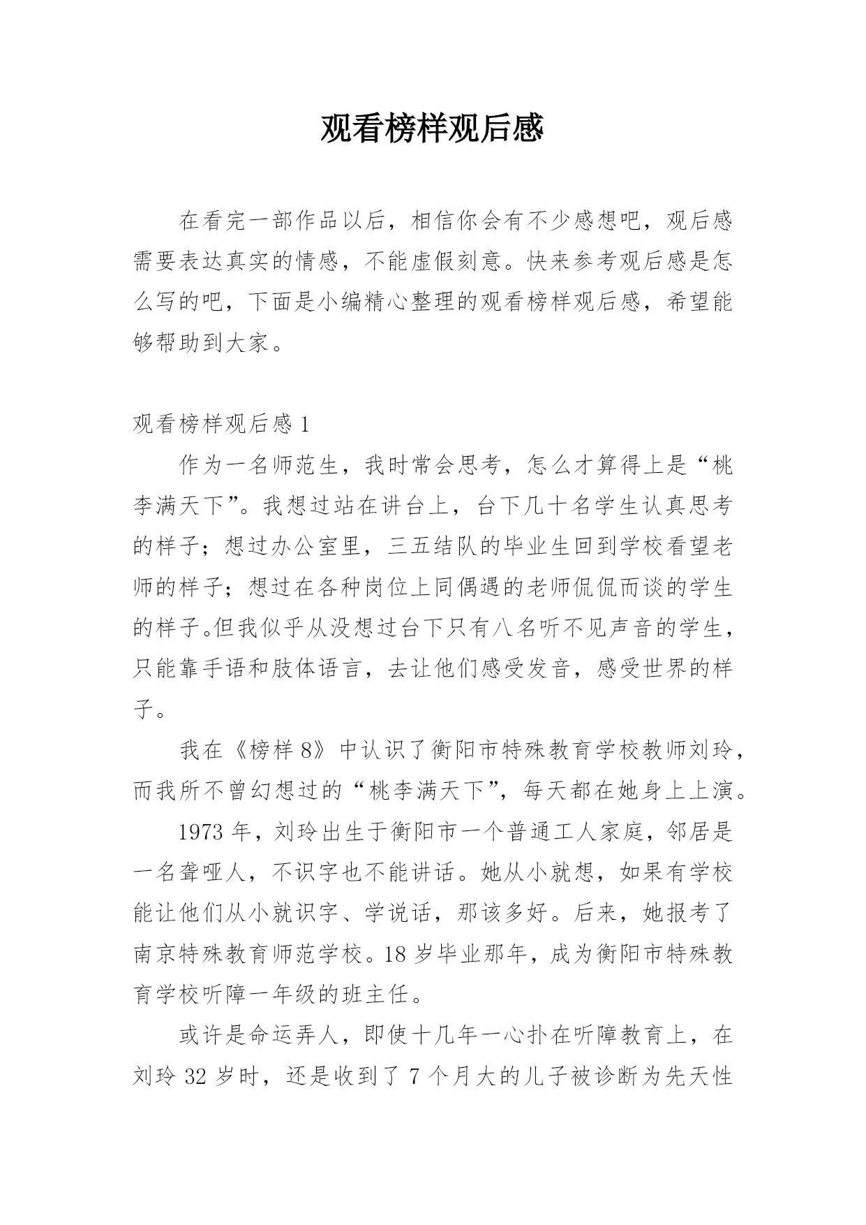 观看榜样观后感在看完一部作品以后,相信你会有不少感想吧,观后感需要表达真实的情感,不能虚假刻意。快来参考观后感是怎么写的吧,下面是小编精心整理的观看榜样观后感,希望能够帮助到大家。观看榜样观后感1作为一名师范生,我时常会思考,怎么才算得上是“桃李满天下”。我想过站在讲台上,台下几十名学生认真思考的样子;想过办公室里,三五结队的毕业生回到学校看望老师的样子;想过在各种岗位上同偶遇的老师侃侃而谈的学生的样子。但我似乎从没想过台下只有八名听不见声音的学生,只能靠手语和肢体语言,去让他们感受发音,感受世界的样子。