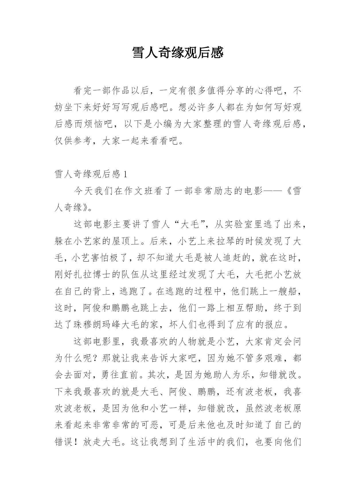 雪人奇缘观后感看完一部作品以后,一定有很多值得分享的心得吧,不妨坐下来好好写写观后感吧。想必许多人都在为如何写好观后感而烦恼吧,以下是小编为大家整理的雪人奇缘观后感,仅供参考,大家一起来看看吧。雪人奇缘观后感1今天我们在作文班看了一部非常励志的电影——《雪人奇缘》。这部电影主要讲了雪人“大毛”,从实验室里逃了出来,躲在小艺家的屋顶上。后来,小艺上来拉琴的时候发现了大毛,小艺害怕极了,却不知道大毛是被人追赶的,就在这时,刚好扎拉博士的队伍从这里经过发现了大毛,大毛把小艺放在自己的背上,逃跑了。在逃跑的过程中