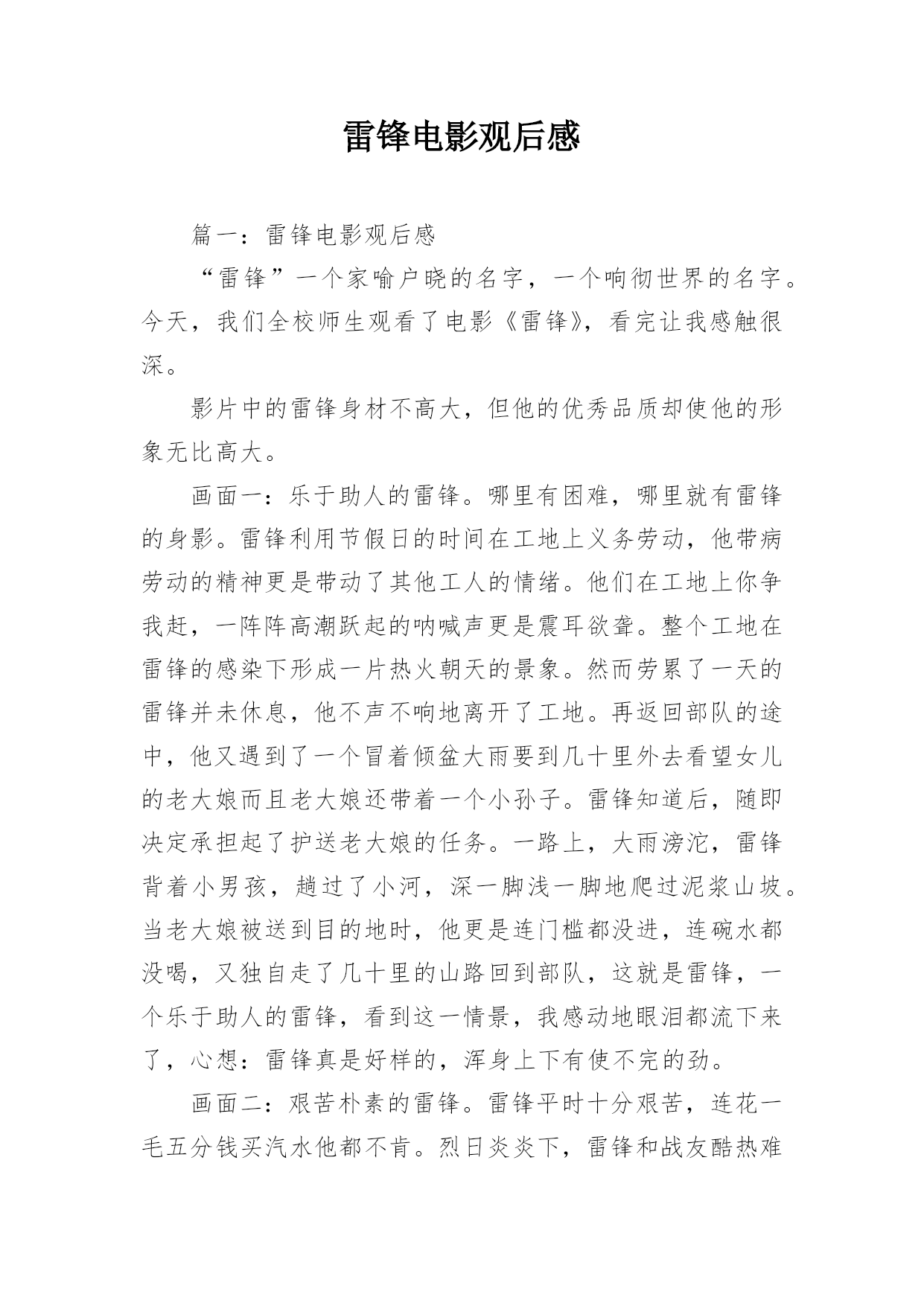 雷锋电影观后感篇一:雷锋电影观后感“雷锋”一个家喻户晓的名字,一个响彻世界的名字。今天,我们全校师生观看了电影《雷锋》,看完让我感触很深。影片中的雷锋身材不高大,但他的优秀品质却使他的形象无比高大。画面一:乐于助人的雷锋。哪里有困难,哪里就有雷锋的身影。雷锋利用节假日的时间在工地上义务劳动,他带病劳动的精神更是带动了其他工人的情绪。他们在工地上你争我赶,一阵阵高潮跃起的呐喊声更是震耳欲聋。整个工地在雷锋的感染下形成一片热火朝天的景象。然而劳累了一天的雷锋并未休息,他不声不响地离开了工地。再返回部队的途中,