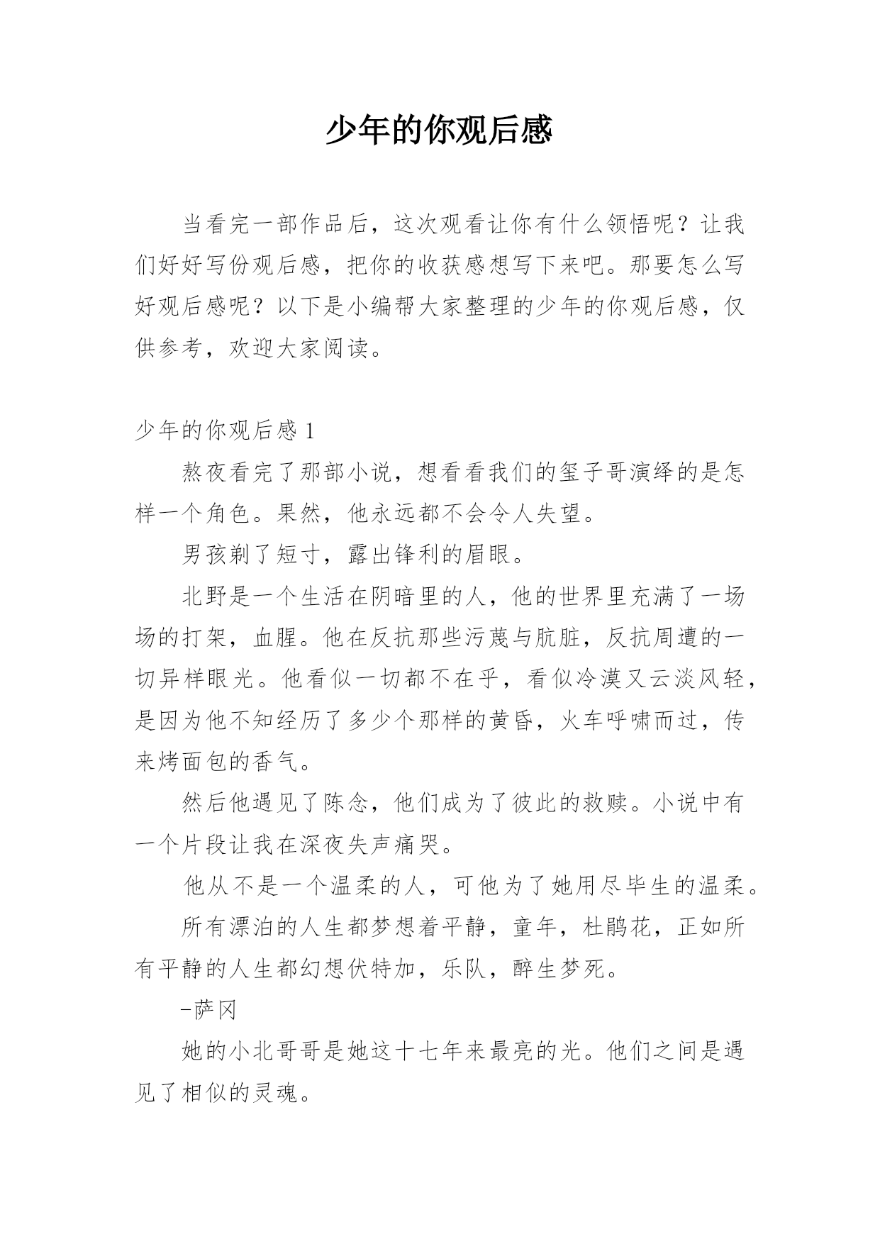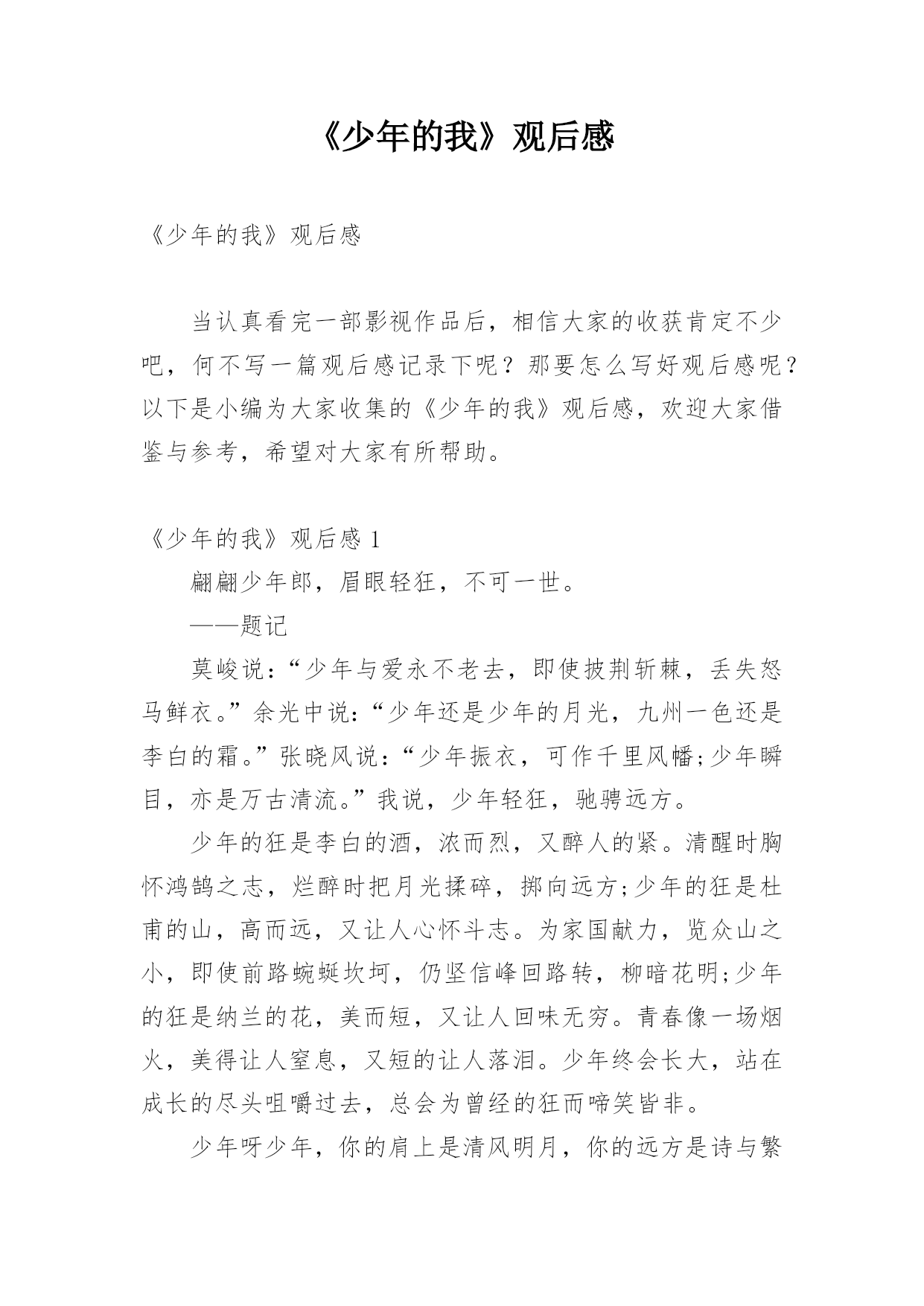 《少年的我》观后感《少年的我》观后感当认真看完一部影视作品后,相信大家的收获肯定不少吧,何不写一篇观后感记录下呢?那要怎么写好观后感呢?以下是小编为大家收集的《少年的我》观后感,欢迎大家借鉴与参考,希望对大家有所帮助。《少年的我》观后感1翩翩少年郎,眉眼轻狂,不可一世。——题记莫峻说:“少年与爱永不老去,即使披荆斩棘,丢失怒马鲜衣。”余光中说:“少年还是少年的月光,九州一色还是李白的霜。”张晓风说:“少年振衣,可作千里风幡;少年瞬目,亦是万古清流。”我说,少年轻狂,驰骋远方。少年的狂是李白的酒,浓而烈,又