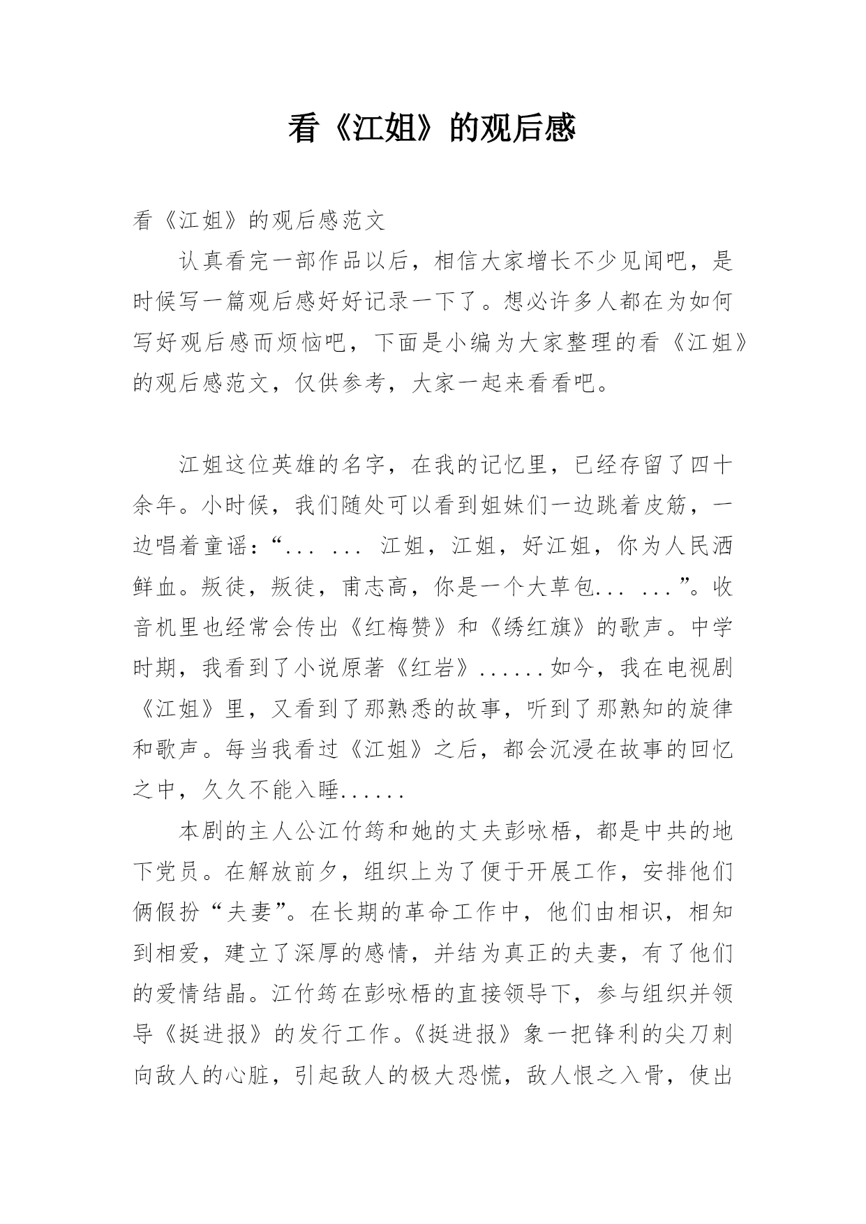看《江姐》的观后感看《江姐》的观后感范文认真看完一部作品以后,相信大家增长不少见闻吧,是时候写一篇观后感好好记录一下了。想必许多人都在为如何写好观后感而烦恼吧,下面是小编为大家整理的看《江姐》的观后感范文,仅供参考,大家一起来看看吧。江姐这位英雄的名字,在我的记忆里,已经存留了四十余年。小时候,我们随处可以看到姐妹们一边跳着皮筋,一边唱着童谣:“......江姐,江姐,好江姐,你为人民洒鲜血。叛徒,叛徒,甫志高,你是一个大草包......”。收音机里也经常会传出《红梅赞》和《绣红旗》的歌声。中学时期,我看