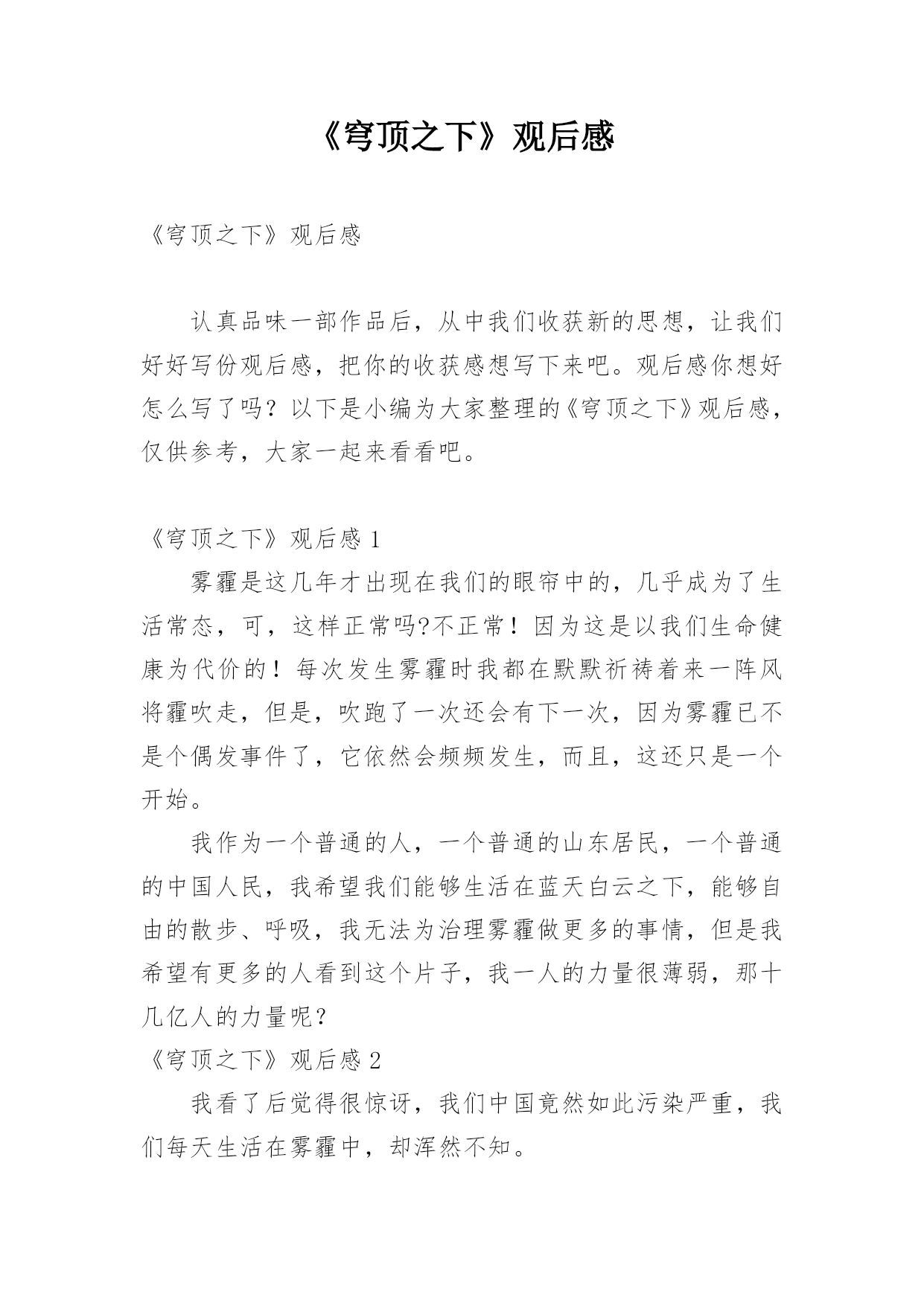 《穹顶之下》观后感《穹顶之下》观后感认真品味一部作品后,从中我们收获新的思想,让我们好好写份观后感,把你的收获感想写下来吧。观后感你想好怎么写了吗?以下是小编为大家整理的《穹顶之下》观后感,仅供参考,大家一起来看看吧。《穹顶之下》观后感1雾霾是这几年才出现在我们的眼帘中的,几乎成为了生活常态,可,这样正常吗?不正常!因为这是以我们生命健康为代价的!每次发生雾霾时我都在默默祈祷着来一阵风将霾吹走,但是,吹跑了一次还会有下一次,因为雾霾已不是个偶发事件了,它依然会频频发生,而且,这还只是一个开始。我作为一个普