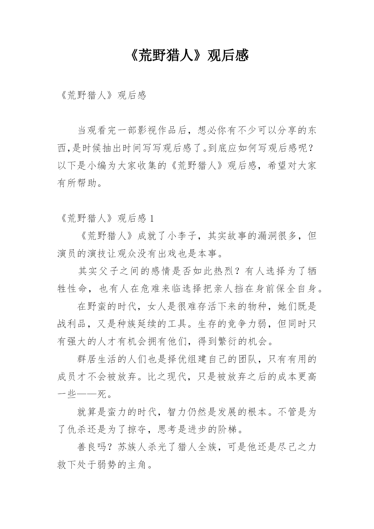 《荒野猎人》观后感《荒野猎人》观后感当观看完一部影视作品后,想必你有不少可以分享的东西,是时候抽出时间写写观后感了。到底应如何写观后感呢?以下是小编为大家收集的《荒野猎人》观后感,希望对大家有所帮助。《荒野猎人》观后感1《荒野猎人》成就了小李子,其实故事的漏洞很多,但演员的演技让观众没有出戏也是本事。其实父子之间的感情是否如此热烈?有人选择为了牺牲性命,也有人在危难来临选择把亲人挡在身前保全自身。在野蛮的时代,女人是很难存活下来的物种,她们既是战利品,又是种族延续的工具。生存的竞争力弱,但同时只有强大的人