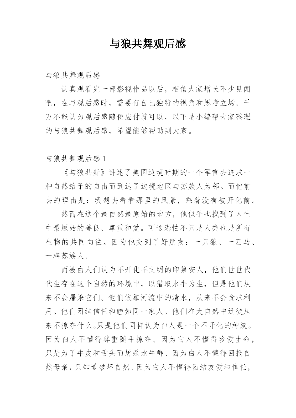与狼共舞观后感与狼共舞观后感认真观看完一部影视作品以后,相信大家增长不少见闻吧,在写观后感时,需要有自己独特的视角和思考立场。千万不能认为观后感随便应付就可以,以下是小编帮大家整理的与狼共舞观后感,希望能够帮助到大家。与狼共舞观后感1《与狼共舞》讲述了美国边境时期的一个军官去追求一种自然给予的自由而到达了边境地区与苏族人为邻。而他前去的理由是:我想去看看那里的风景,乘着没有被开化前。然而在这个最自然最原始的地方,他似乎也找到了人性中最原始的善良、尊重和爱。可这恐怕不只是人类也是所有生物的共同向往。因为他交