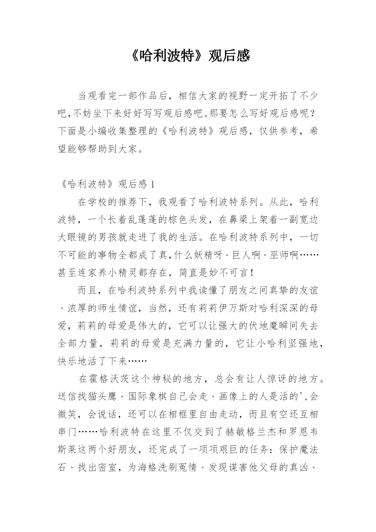 《哈利波特》观后感当观看完一部作品后,相信大家的视野一定开拓了不少吧,不妨坐下来好好写写观后感吧。那要怎么写好观后感呢?下面是小编收集整理的《哈利波特》观后感,仅供参考,希望能够帮助到大家。《哈利波特》观后感1在学校的推荐下,我观看了哈利波特系列。从此,哈利波特,一个长着乱蓬蓬的棕色头发,在鼻梁上架着一副宽边大眼镜的男孩就走进了我的生活。在哈利波特系列中,一切不可能的事物全都成了真,什么妖精呀﹑巨人啊﹑巫师啊……甚至连家养小精灵都存在,简直是妙不可言!而且,在哈利波特系列中我读懂了朋友之间真挚的友谊﹑浓厚