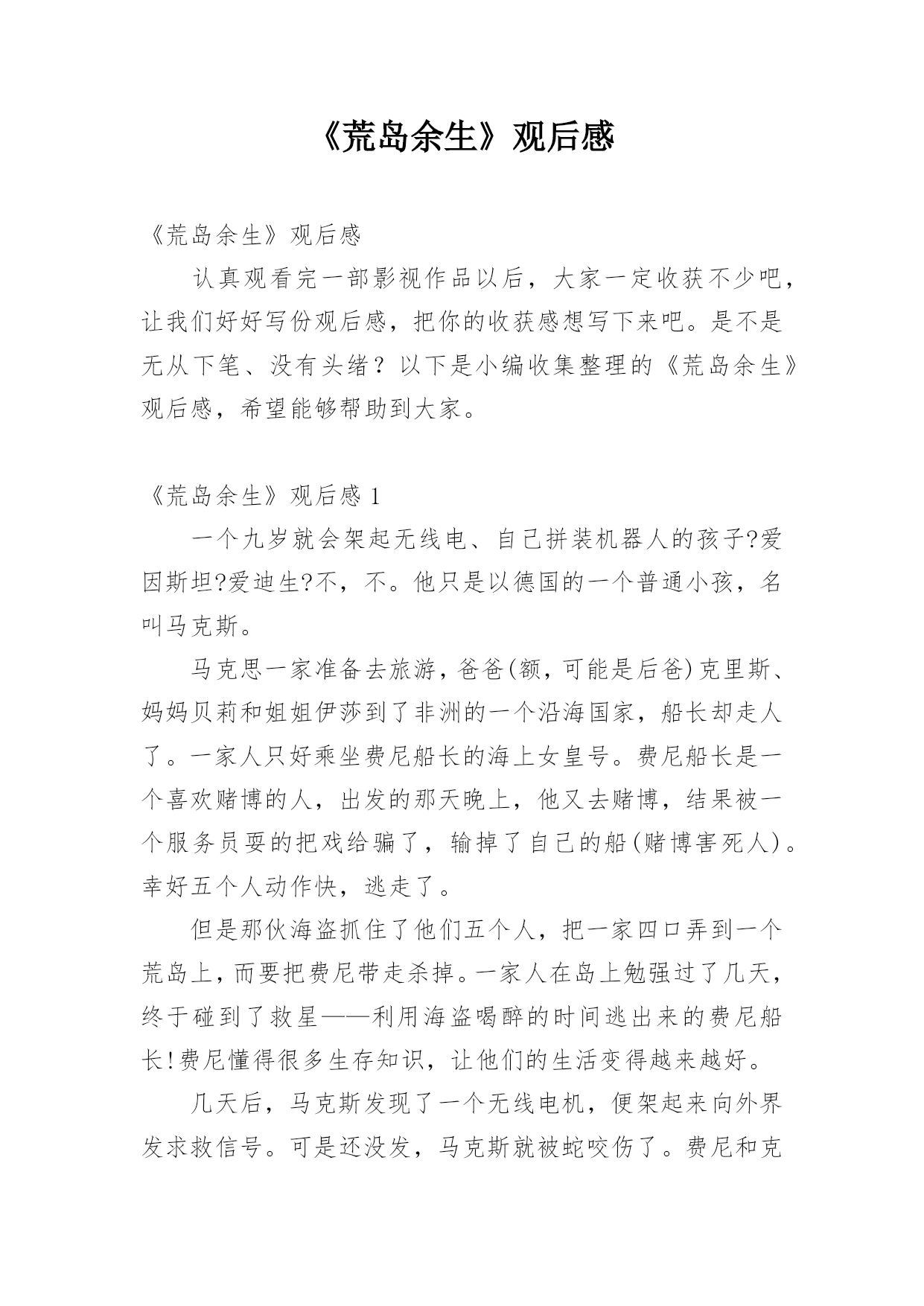 《荒岛余生》观后感《荒岛余生》观后感认真观看完一部影视作品以后,大家一定收获不少吧,让我们好好写份观后感,把你的收获感想写下来吧。是不是无从下笔、没有头绪?以下是小编收集整理的《荒岛余生》观后感,希望能够帮助到大家。《荒岛余生》观后感1一个九岁就会架起无线电、自己拼装机器人的孩子?爱因斯坦?爱迪生?不,不。他只是以德国的一个普通小孩,名叫马克斯。马克思一家准备去旅游,爸爸(额,可能是后爸)克里斯、妈妈贝莉和姐姐伊莎到了非洲的一个沿海国家,船长却走人了。一家人只好乘坐费尼船长的海上女皇号。费尼船长是一个喜欢