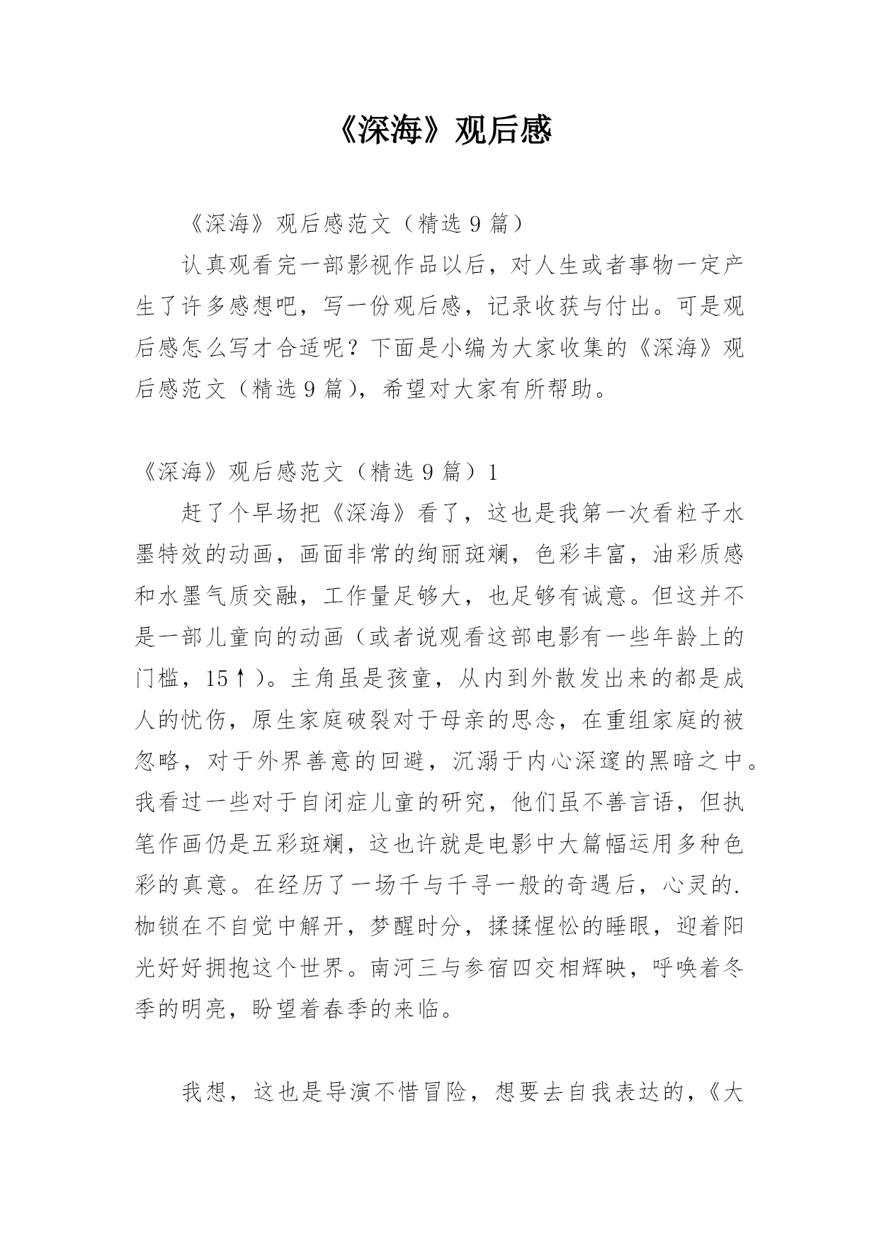 《深海》观后感《深海》观后感范文(精选9篇)认真观看完一部影视作品以后,对人生或者事物一定产生了许多感想吧,写一份观后感,记录收获与付出。可是观后感怎么写才合适呢?下面是小编为大家收集的《深海》观后感范文(精选9篇),希望对大家有所帮助。《深海》观后感范文(精选9篇)1赶了个早场把《深海》看了,这也是我第一次看粒子水墨特效的动画,画面非常的绚丽斑斓,色彩丰富,油彩质感和水墨气质交融,工作量足够大,也足够有诚意。但这并不是一部儿童向的动画(或者说观看这部电影有一些年龄上的门槛,15↑)。主角虽是孩童,从内到