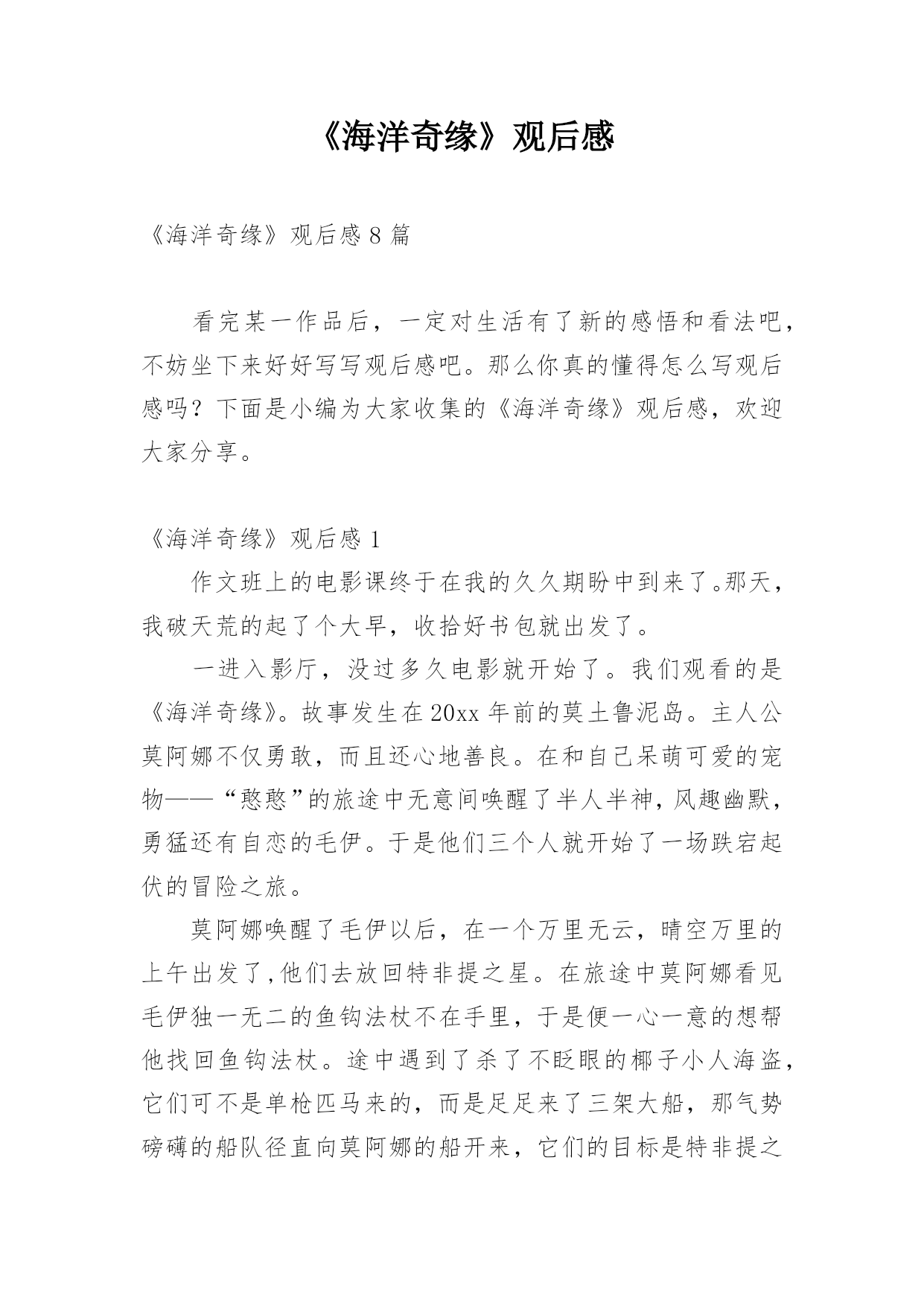 《海洋奇缘》观后感《海洋奇缘》观后感8篇看完某一作品后,一定对生活有了新的感悟和看法吧,不妨坐下来好好写写观后感吧。那么你真的懂得怎么写观后感吗?下面是小编为大家收集的《海洋奇缘》观后感,欢迎大家分享。《海洋奇缘》观后感1作文班上的电影课终于在我的久久期盼中到来了。那天,我破天荒的起了个大早,收拾好书包就出发了。一进入影厅,没过多久电影就开始了。我们观看的是《海洋奇缘》。故事发生在20xx年前的莫土鲁泥岛。主人公莫阿娜不仅勇敢,而且还心地善良。在和自己呆萌可爱的宠物——“憨憨”的旅途中无意间唤醒了半人半神