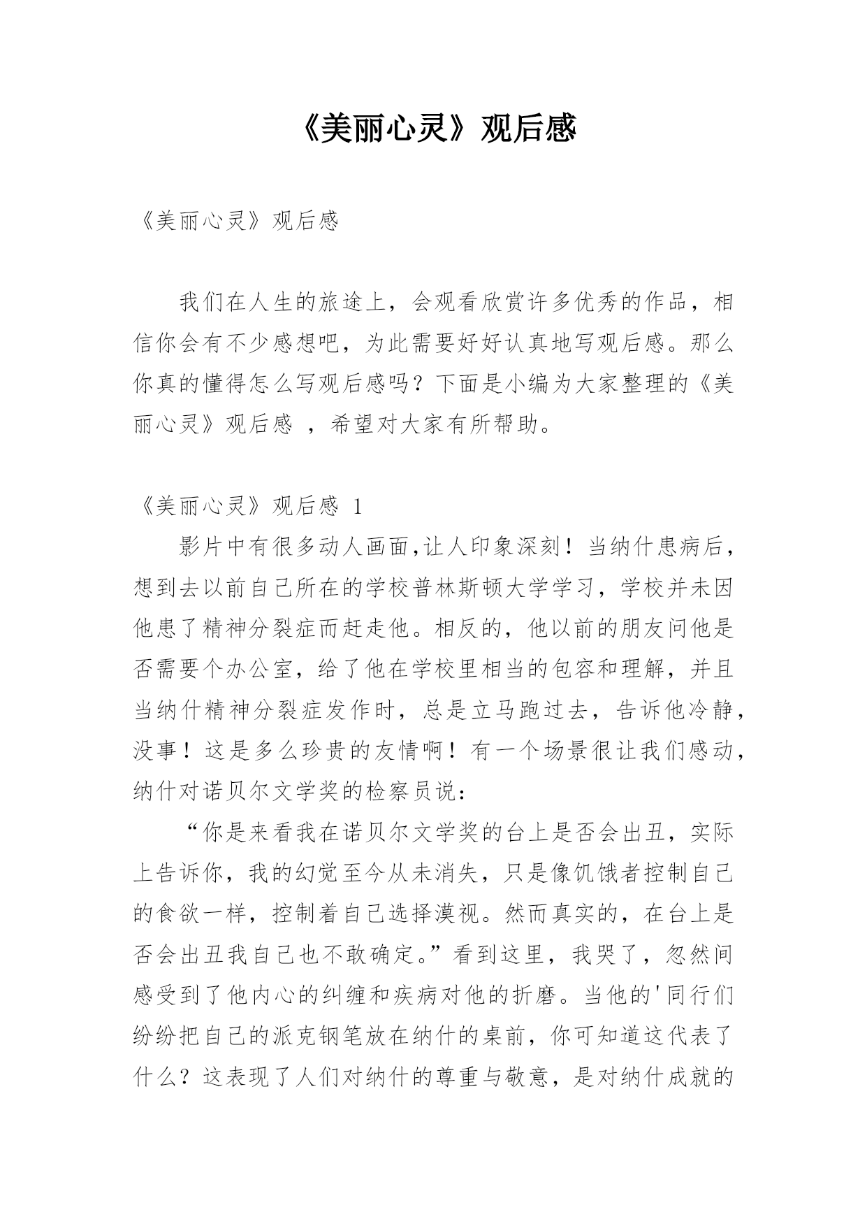 《美丽心灵》观后感《美丽心灵》观后感我们在人生的旅途上,会观看欣赏许多优秀的作品,相信你会有不少感想吧,为此需要好好认真地写观后感。那么你真的懂得怎么写观后感吗?下面是小编为大家整理的《美丽心灵》观后感,希望对大家有所帮助。《美丽心灵》观后感1影片中有很多动人画面,让人印象深刻!当纳什患病后,想到去以前自己所在的学校普林斯顿大学学习,学校并未因他患了精神分裂症而赶走他。相反的,他以前的朋友问他是否需要个办公室,给了他在学校里相当的包容和理解,并且当纳什精神分裂症发作时,总是立马跑过去,告诉他冷静,没事!这