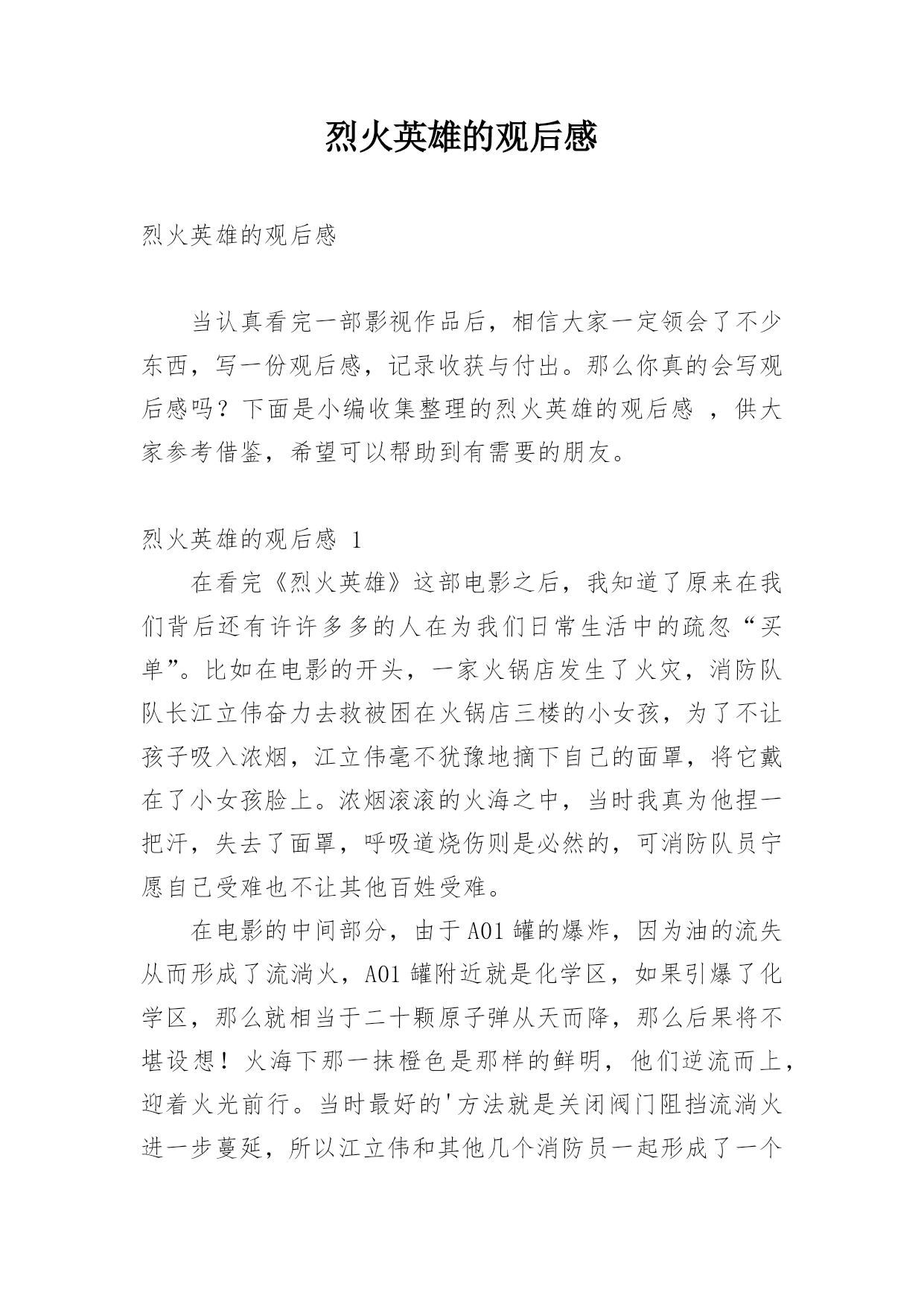 烈火英雄的观后感烈火英雄的观后感当认真看完一部影视作品后,相信大家一定领会了不少东西,写一份观后感,记录收获与付出。那么你真的会写观后感吗?下面是小编收集整理的烈火英雄的观后感,供大家参考借鉴,希望可以帮助到有需要的朋友。烈火英雄的观后感1在看完《烈火英雄》这部电影之后,我知道了原来在我们背后还有许许多多的人在为我们日常生活中的疏忽“买单”。比如在电影的开头,一家火锅店发生了火灾,消防队队长江立伟奋力去救被困在火锅店三楼的小女孩,为了不让孩子吸入浓烟,江立伟毫不犹豫地摘下自己的面罩,将它戴在了小女孩脸上。