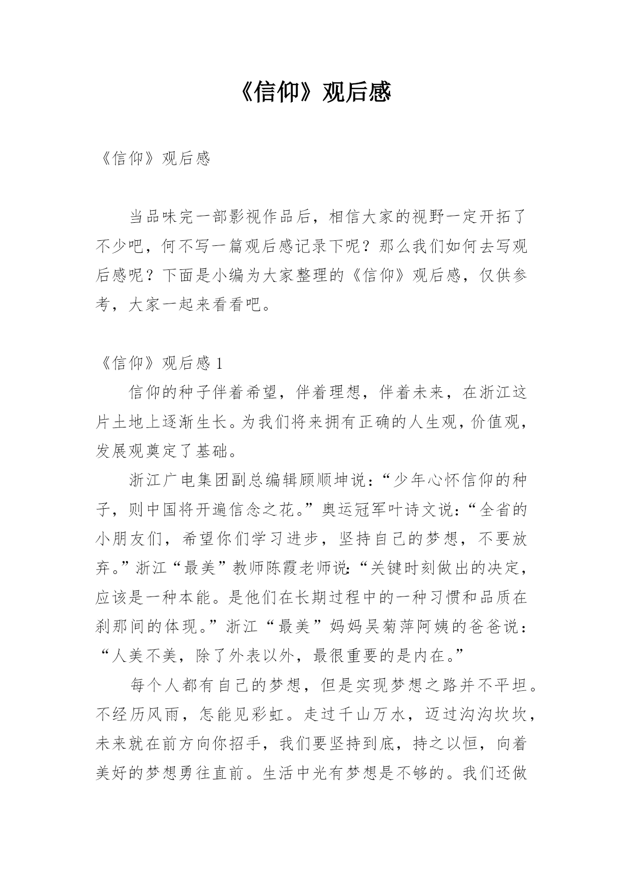 《信仰》观后感《信仰》观后感当品味完一部影视作品后,相信大家的视野一定开拓了不少吧,何不写一篇观后感记录下呢?那么我们如何去写观后感呢?下面是小编为大家整理的《信仰》观后感,仅供参考,大家一起来看看吧。《信仰》观后感1信仰的种子伴着希望,伴着理想,伴着未来,在浙江这片土地上逐渐生长。为我们将来拥有正确的人生观,价值观,发展观奠定了基础。浙江广电集团副总编辑顾顺坤说:“少年心怀信仰的种子,则中国将开遍信念之花。”奥运冠军叶诗文说:“全省的小朋友们,希望你们学习进步,坚持自己的梦想,不要放弃。”浙江“最美”教