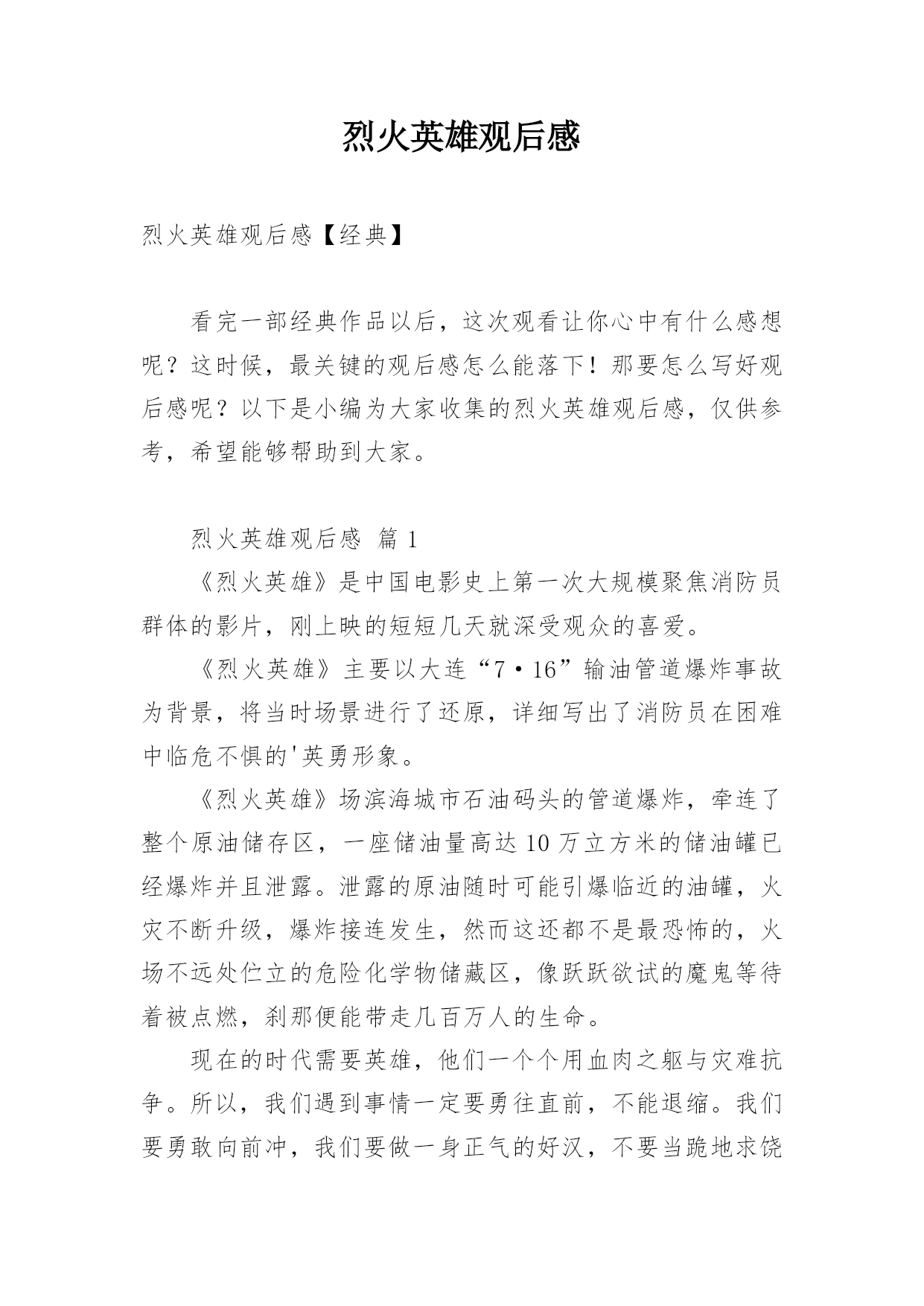 烈火英雄观后感烈火英雄观后感【经典】看完一部经典作品以后,这次观看让你心中有什么感想呢?这时候,最关键的观后感怎么能落下!那要怎么写好观后感呢?以下是小编为大家收集的烈火英雄观后感,仅供参考,希望能够帮助到大家。烈火英雄观后感篇1《烈火英雄》是中国电影史上第一次大规模聚焦消防员群体的影片,刚上映的短短几天就深受观众的喜爱。《烈火英雄》主要以大连“7·16”输油管道爆炸事故为背景,将当时场景进行了还原,详细写出了消防员在困难中临危不惧的'英勇形象。《烈火英雄》场滨海城市石油码头的管道爆炸,牵连了整个原油储存