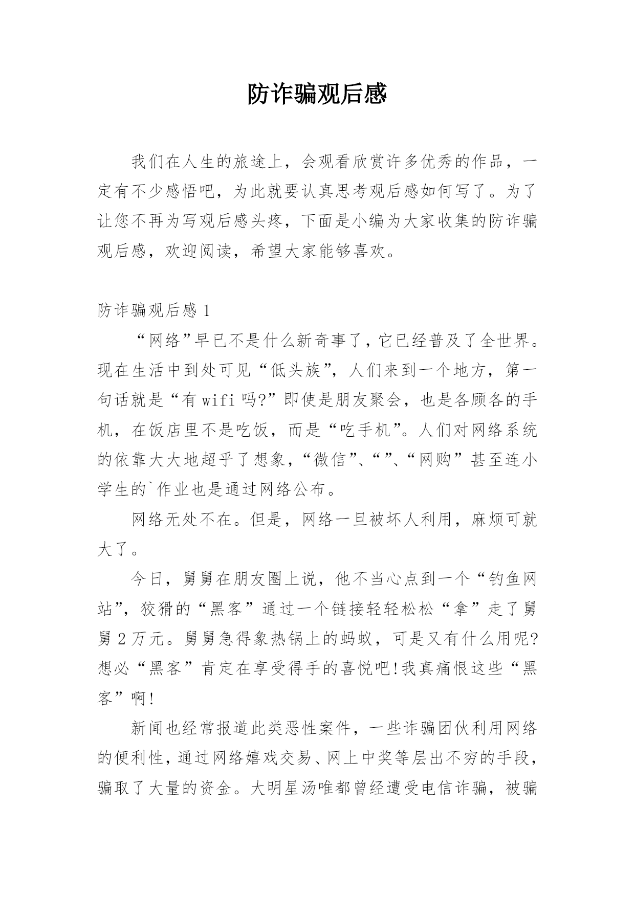 防诈骗观后感我们在人生的旅途上,会观看欣赏许多优秀的作品,一定有不少感悟吧,为此就要认真思考观后感如何写了。为了让您不再为写观后感头疼,下面是小编为大家收集的防诈骗观后感,欢迎阅读,希望大家能够喜欢。防诈骗观后感1“网络”早已不是什么新奇事了,它已经普及了全世界。现在生活中到处可见“低头族”,人们来到一个地方,第一句话就是“有wifi吗?”即使是朋友聚会,也是各顾各的手机,在饭店里不是吃饭,而是“吃手机”。人们对网络系统的依靠大大地超乎了想象,“微信”、“”、“网购”甚至连小学生的`作业也是通过网络公布。