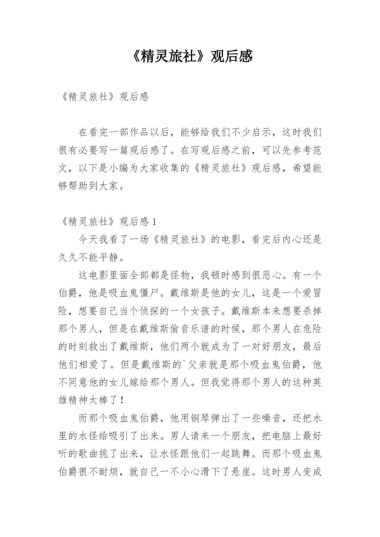《精灵旅社》观后感《精灵旅社》观后感在看完一部作品以后,能够给我们不少启示,这时我们很有必要写一篇观后感了。在写观后感之前,可以先参考范文,以下是小编为大家收集的《精灵旅社》观后感,希望能够帮助到大家。《精灵旅社》观后感1今天我看了一场《精灵旅社》的电影,看完后内心还是久久不能平静。这电影里面全部都是怪物,我顿时感到很恶心。有一个伯爵,他是吸血鬼僵尸。戴维斯是他的女儿,这是一个爱冒险,想要自己当个侦探的一个女孩子。戴维斯本来想要杀掉那个男人,但是在戴维斯偷音乐谱的时候,那个男人在危险的时刻救出了戴维斯,他