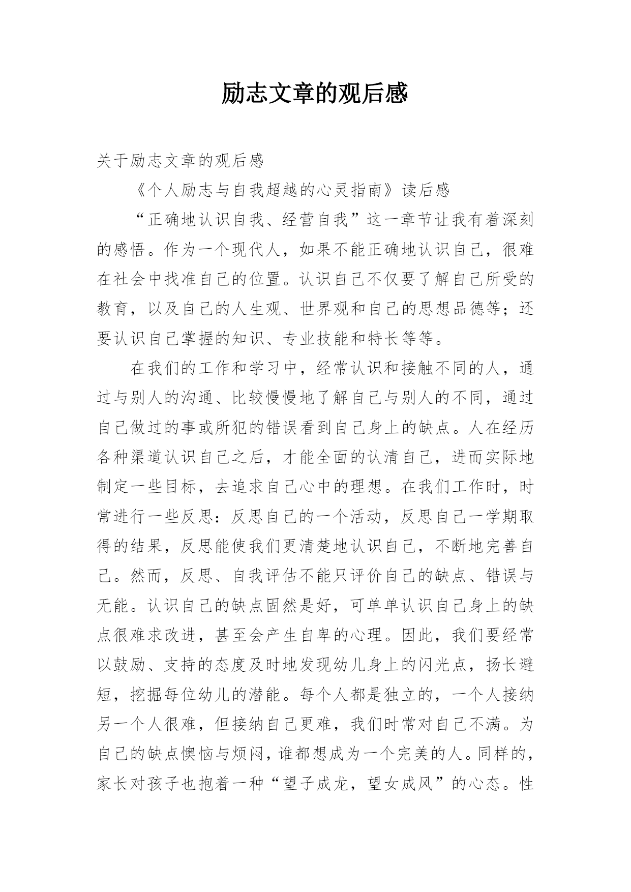 励志文章的观后感关于励志文章的观后感《个人励志与自我超越的心灵指南》读后感“正确地认识自我、经营自我”这一章节让我有着深刻的感悟。作为一个现代人,如果不能正确地认识自己,很难在社会中找准自己的位置。认识自己不仅要了解自己所受的教育,以及自己的人生观、世界观和自己的思想品德等;还要认识自己掌握的知识、专业技能和特长等等。在我们的工作和学习中,经常认识和接触不同的人,通过与别人的沟通、比较慢慢地了解自己与别人的不同,通过自己做过的事或所犯的错误看到自己身上的缺点。人在经历各种渠道认识自己之后,才能全面的认清自