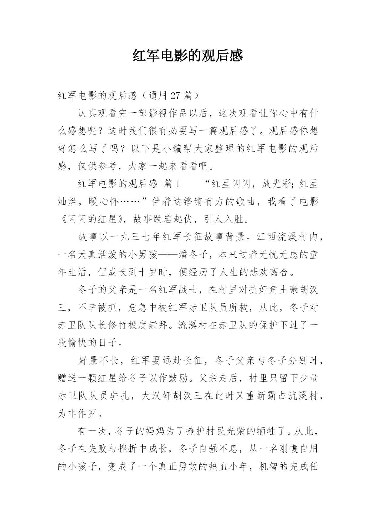 红军电影的观后感红军电影的观后感(通用27篇)认真观看完一部影视作品以后,这次观看让你心中有什么感想呢?这时我们很有必要写一篇观后感了。观后感你想好怎么写了吗?以下是小编帮大家整理的红军电影的观后感,仅供参考,大家一起来看看吧。红军电影的观后感篇1“红星闪闪,放光彩;红星灿烂,暖心怀……”伴着这铿锵有力的歌曲,我看了电影《闪闪的红星》,故事跌宕起伏,引人入胜。故事以一九三七年红军长征故事背景。江西流溪村内,一名天真活泼的小男孩——潘冬子,本来过着无忧无虑的童年生活,但成长到十岁时,便经历了人生的悲欢离合。