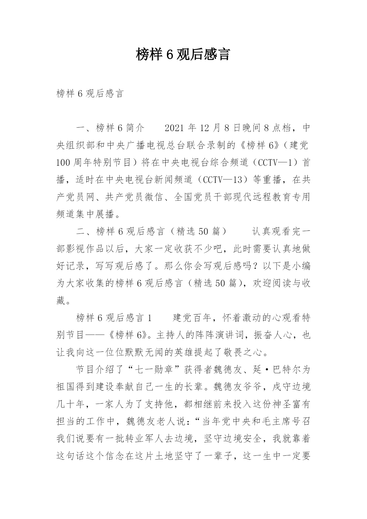 榜样6观后感言榜样6观后感言一、榜样6简介2021年12月8日晚间8点档,中央组织部和中央广播电视总台联合录制的《榜样6》(建党100周年特别节目)将在中央电视台综合频道(CCTV—1)首播,适时在中央电视台新闻频道(CCTV—13)等重播,在共产党员网、共产党员微信、全国党员干部现代远程教育专用频道集中展播。二、榜样6观后感言(精选50篇)认真观看完一部影视作品以后,大家一定收获不少吧,此时需要认真地做好记录,写写观后感了。那么你会写观后感吗?以下是小编为大家收集的榜样6观后感言(精选50篇),欢迎阅读