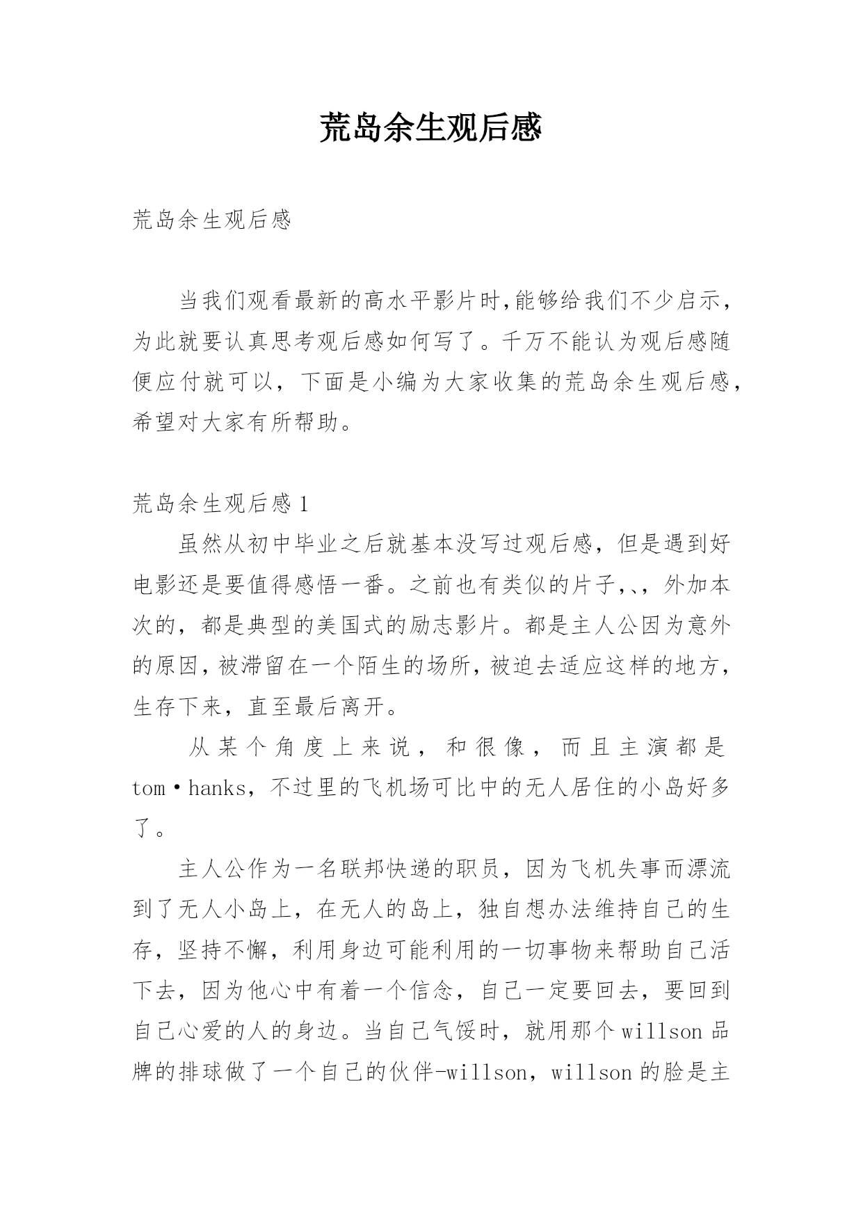 荒岛余生观后感荒岛余生观后感当我们观看最新的高水平影片时,能够给我们不少启示,为此就要认真思考观后感如何写了。千万不能认为观后感随便应付就可以,下面是小编为大家收集的荒岛余生观后感,希望对大家有所帮助。荒岛余生观后感1虽然从初中毕业之后就基本没写过观后感,但是遇到好电影还是要值得感悟一番。之前也有类似的片子,、,外加本次的,都是典型的美国式的励志影片。都是主人公因为意外的原因,被滞留在一个陌生的场所,被迫去适应这样的地方,生存下来,直至最后离开。从某个角度上来说,和很像,而且主演都是tom·hanks,不