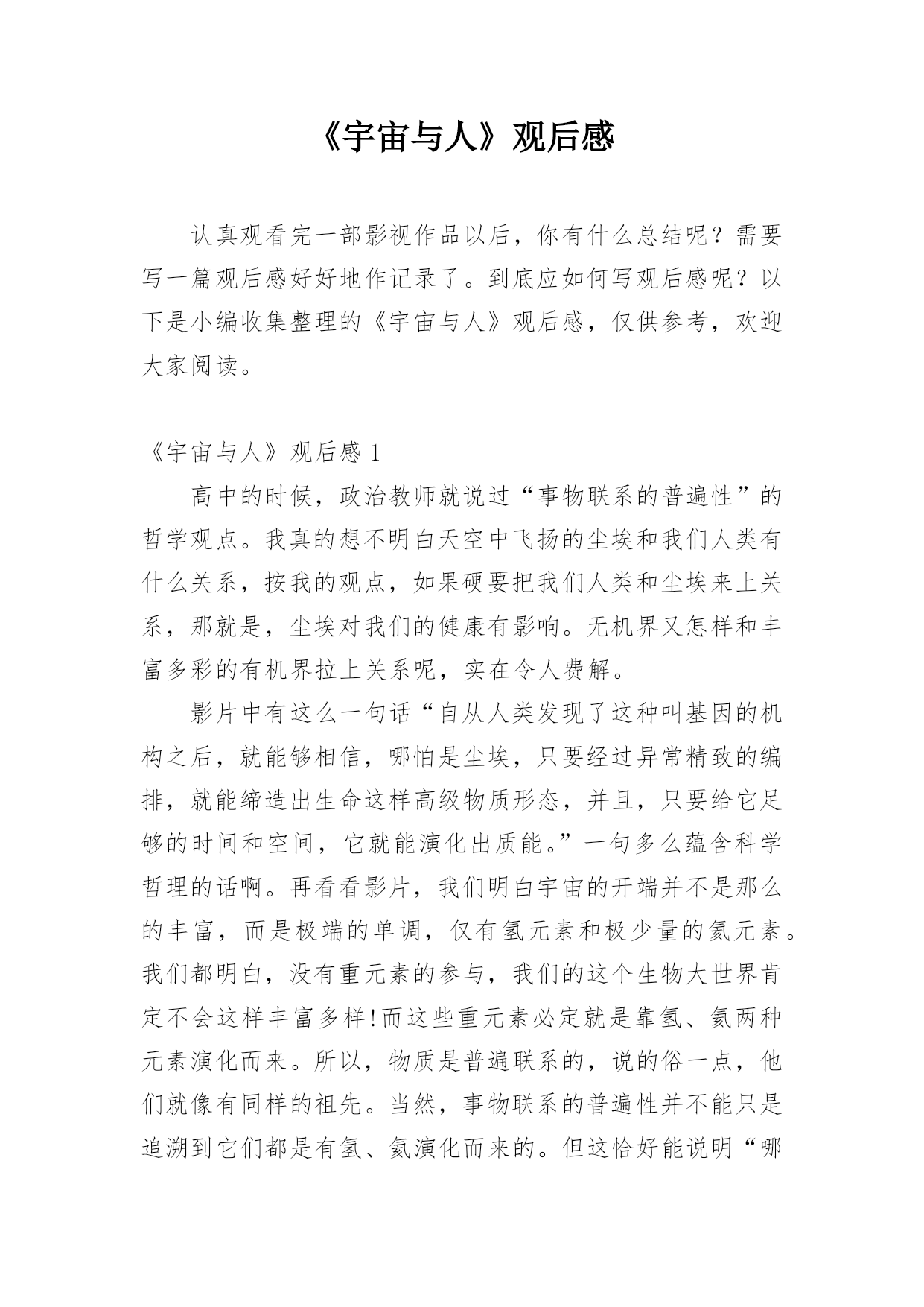 《宇宙与人》观后感认真观看完一部影视作品以后,你有什么总结呢?需要写一篇观后感好好地作记录了。到底应如何写观后感呢?以下是小编收集整理的《宇宙与人》观后感,仅供参考,欢迎大家阅读。《宇宙与人》观后感1高中的时候,政治教师就说过“事物联系的普遍性”的哲学观点。我真的想不明白天空中飞扬的尘埃和我们人类有什么关系,按我的观点,如果硬要把我们人类和尘埃来上关系,那就是,尘埃对我们的健康有影响。无机界又怎样和丰富多彩的有机界拉上关系呢,实在令人费解。影片中有这么一句话“自从人类发现了这种叫基因的机构之后,就能够相信