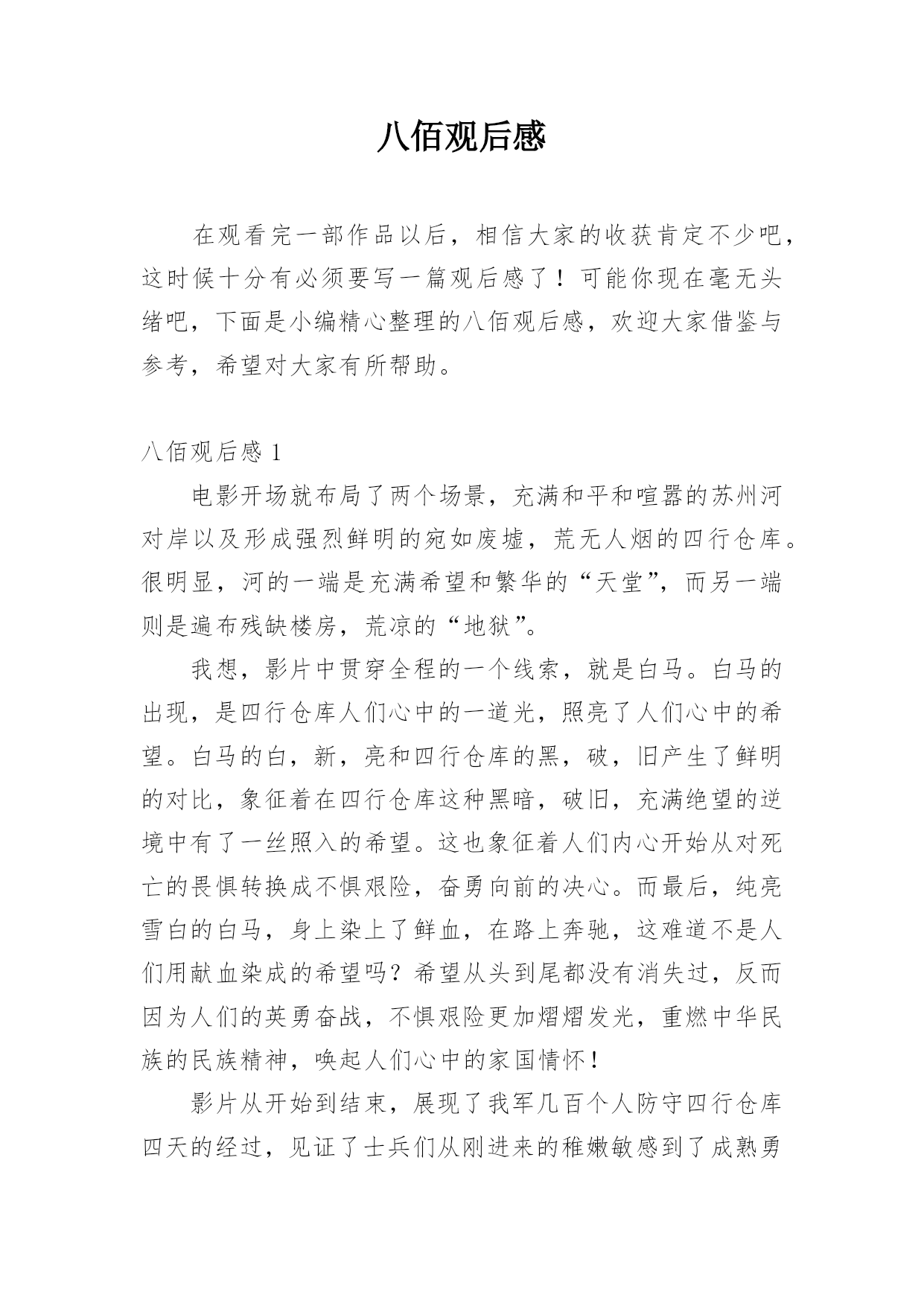 八佰观后感在观看完一部作品以后,相信大家的收获肯定不少吧,这时候十分有必须要写一篇观后感了!可能你现在毫无头绪吧,下面是小编精心整理的八佰观后感,欢迎大家借鉴与参考,希望对大家有所帮助。八佰观后感1电影开场就布局了两个场景,充满和平和喧嚣的苏州河对岸以及形成强烈鲜明的宛如废墟,荒无人烟的四行仓库。很明显,河的一端是充满希望和繁华的“天堂”,而另一端则是遍布残缺楼房,荒凉的“地狱”。我想,影片中贯穿全程的一个线索,就是白马。白马的出现,是四行仓库人们心中的一道光,照亮了人们心中的希望。白马的白,新,亮和四行