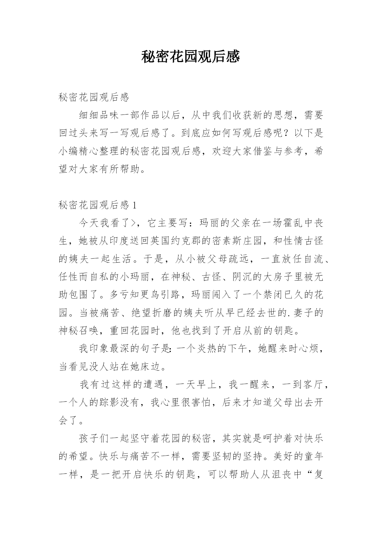 秘密花园观后感秘密花园观后感细细品味一部作品以后,从中我们收获新的思想,需要回过头来写一写观后感了。到底应如何写观后感呢?以下是小编精心整理的秘密花园观后感,欢迎大家借鉴与参考,希望对大家有所帮助。秘密花园观后感1今天我看了>,它主要写:玛丽的父亲在一场霍乱中丧生,她被从印度送回英国约克郡的密素斯庄园,和性情古怪的姨夫一起生活。于是,从小被父母疏远,一直放任自流、任性而自私的小玛丽,在神秘、古怪、阴沉的大房子里被无助包围了。多亏知更鸟引路,玛丽闯入了一个禁闭已久的花园。当被痛苦、绝望折磨的姨夫听从早已经去