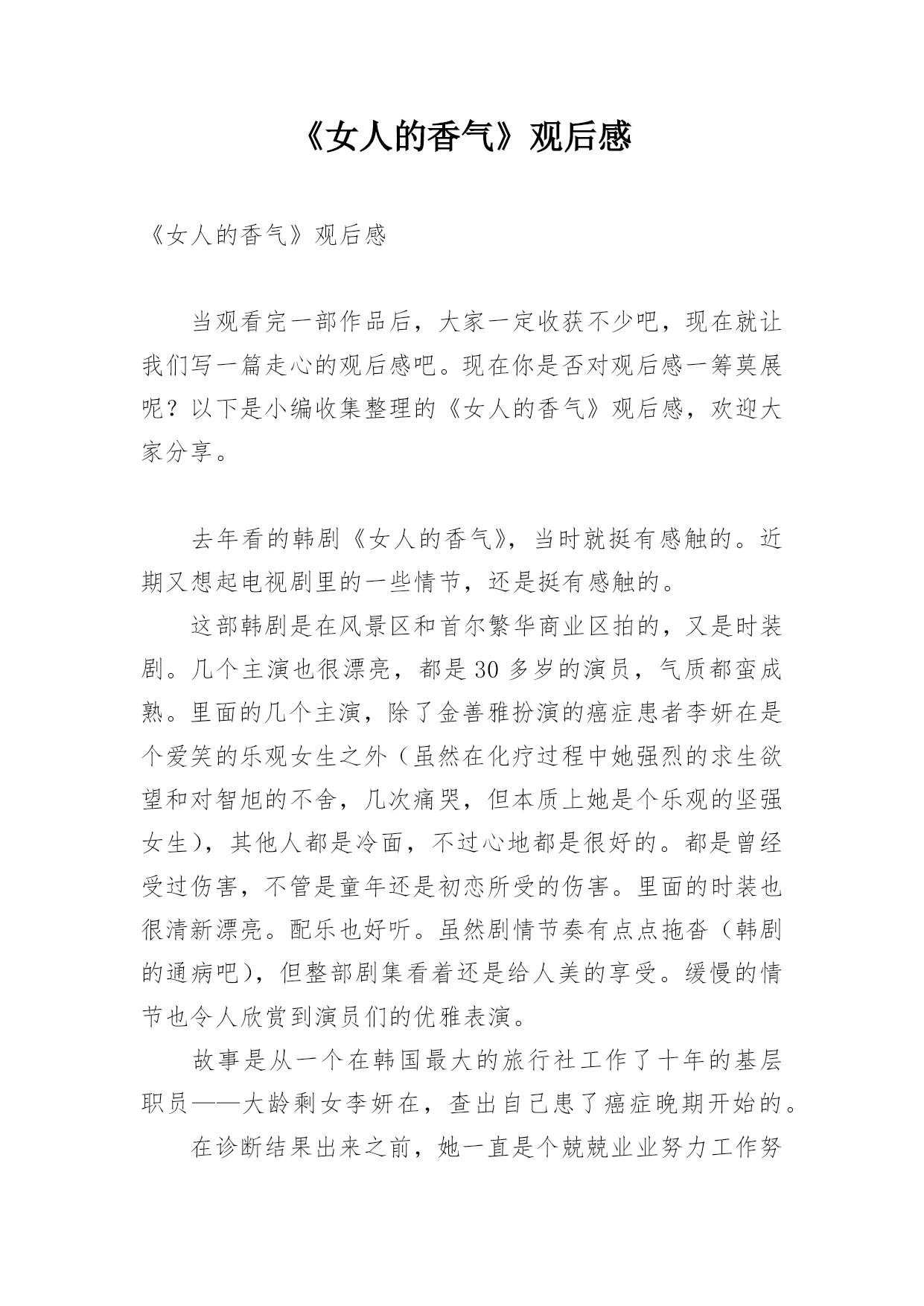 《女人的香气》观后感《女人的香气》观后感当观看完一部作品后,大家一定收获不少吧,现在就让我们写一篇走心的观后感吧。现在你是否对观后感一筹莫展呢?以下是小编收集整理的《女人的香气》观后感,欢迎大家分享。去年看的韩剧《女人的香气》,当时就挺有感触的。近期又想起电视剧里的一些情节,还是挺有感触的。这部韩剧是在风景区和首尔繁华商业区拍的,又是时装剧。几个主演也很漂亮,都是30多岁的演员,气质都蛮成熟。里面的几个主演,除了金善雅扮演的癌症患者李妍在是个爱笑的乐观女生之外(虽然在化疗过程中她强烈的求生欲望和对智旭的不