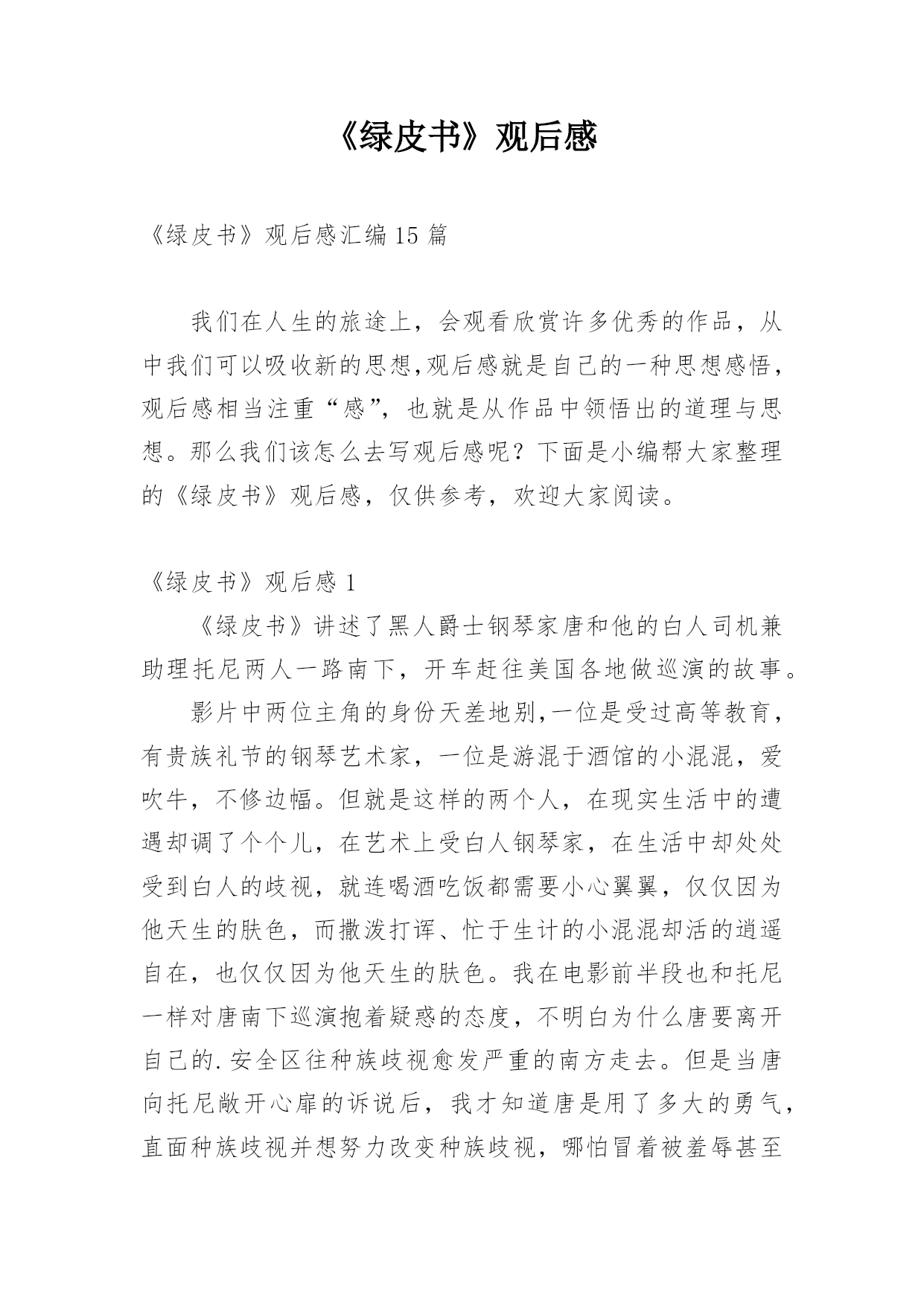 《绿皮书》观后感《绿皮书》观后感汇编15篇我们在人生的旅途上,会观看欣赏许多优秀的作品,从中我们可以吸收新的思想,观后感就是自己的一种思想感悟,观后感相当注重“感”,也就是从作品中领悟出的道理与思想。那么我们该怎么去写观后感呢?下面是小编帮大家整理的《绿皮书》观后感,仅供参考,欢迎大家阅读。《绿皮书》观后感1《绿皮书》讲述了黑人爵士钢琴家唐和他的白人司机兼助理托尼两人一路南下,开车赶往美国各地做巡演的故事。影片中两位主角的身份天差地别,一位是受过高等教育,有贵族礼节的钢琴艺术家,一位是游混于酒馆的小混混,