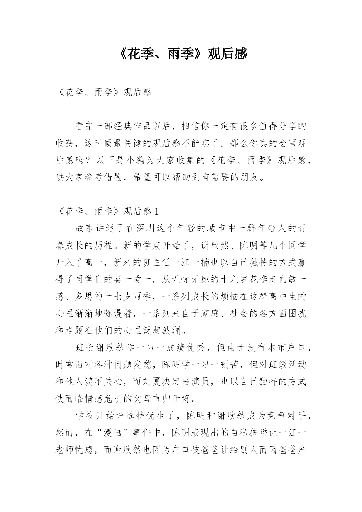《花季、雨季》观后感《花季、雨季》观后感看完一部经典作品以后,相信你一定有很多值得分享的收获,这时候最关键的观后感不能忘了。那么你真的会写观后感吗?以下是小编为大家收集的《花季、雨季》观后感,供大家参考借鉴,希望可以帮助到有需要的朋友。《花季、雨季》观后感1故事讲述了在深圳这个年轻的城市中一群年轻人的青春成长的历程。新的学期开始了,谢欣然、陈明等几个同学升入了高一,新来的班主任一江一楠也以自己独特的方式赢得了同学们的喜一爱一。从无忧无虑的十六岁花季走向敏一感、多思的十七岁雨季,一系列成长的烦恼在这群高中生