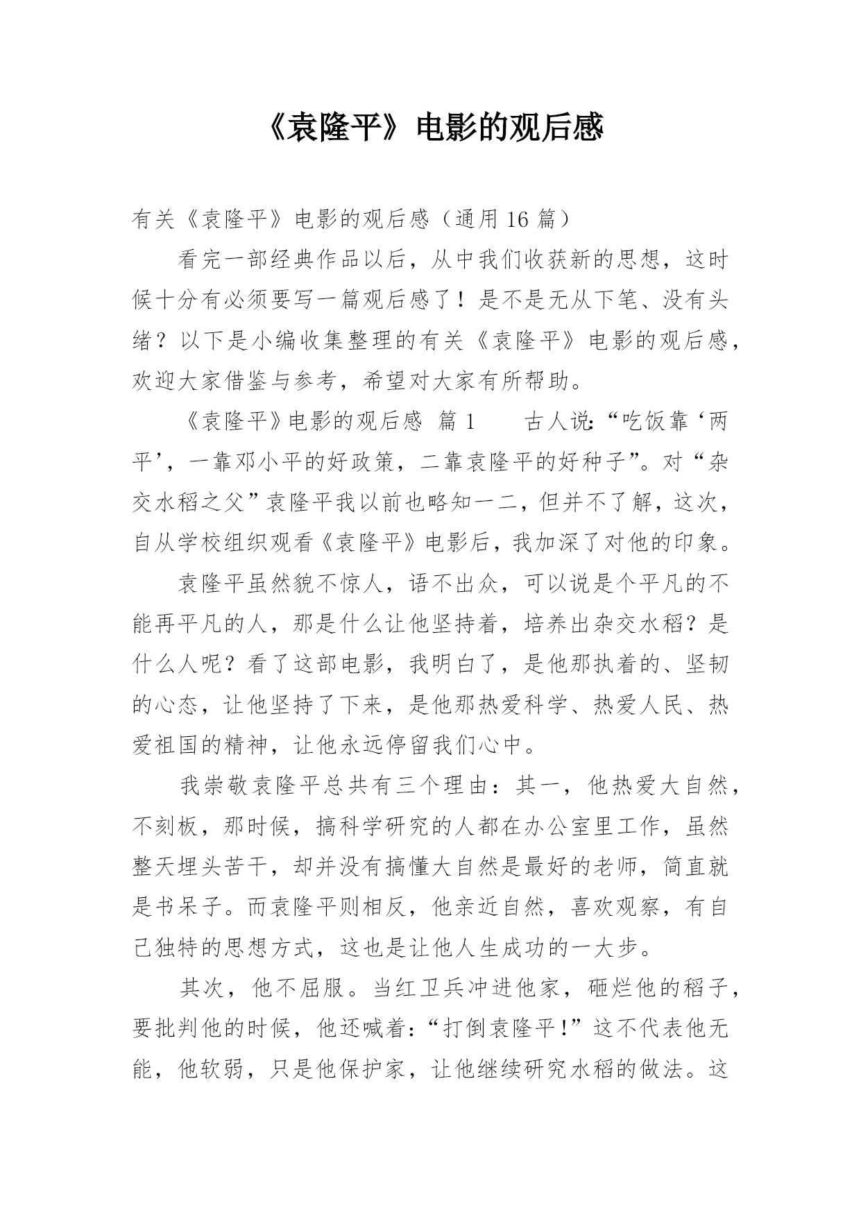 《袁隆平》电影的观后感有关《袁隆平》电影的观后感(通用16篇)看完一部经典作品以后,从中我们收获新的思想,这时候十分有必须要写一篇观后感了!是不是无从下笔、没有头绪?以下是小编收集整理的有关《袁隆平》电影的观后感,欢迎大家借鉴与参考,希望对大家有所帮助。《袁隆平》电影的观后感篇1古人说:“吃饭靠‘两平’,一靠邓小平的好政策,二靠袁隆平的好种子”。对“杂交水稻之父”袁隆平我以前也略知一二,但并不了解,这次,自从学校组织观看《袁隆平》电影后,我加深了对他的印象。袁隆平虽然貌不惊人,语不出众,可以说是个平凡的不