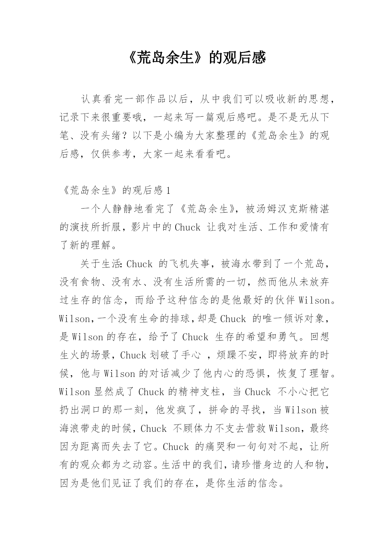 《荒岛余生》的观后感认真看完一部作品以后,从中我们可以吸收新的思想,记录下来很重要哦,一起来写一篇观后感吧。是不是无从下笔、没有头绪?以下是小编为大家整理的《荒岛余生》的观后感,仅供参考,大家一起来看看吧。《荒岛余生》的观后感1一个人静静地看完了《荒岛余生》,被汤姆汉克斯精湛的演技所折服,影片中的Chuck让我对生活、工作和爱情有了新的理解。关于生活:Chuck的飞机失事,被海水带到了一个荒岛,没有食物、没有水、没有生活所需的一切,然而他从未放弃过生存的信念,而给予这种信念的是他最好的伙伴Wilson。W