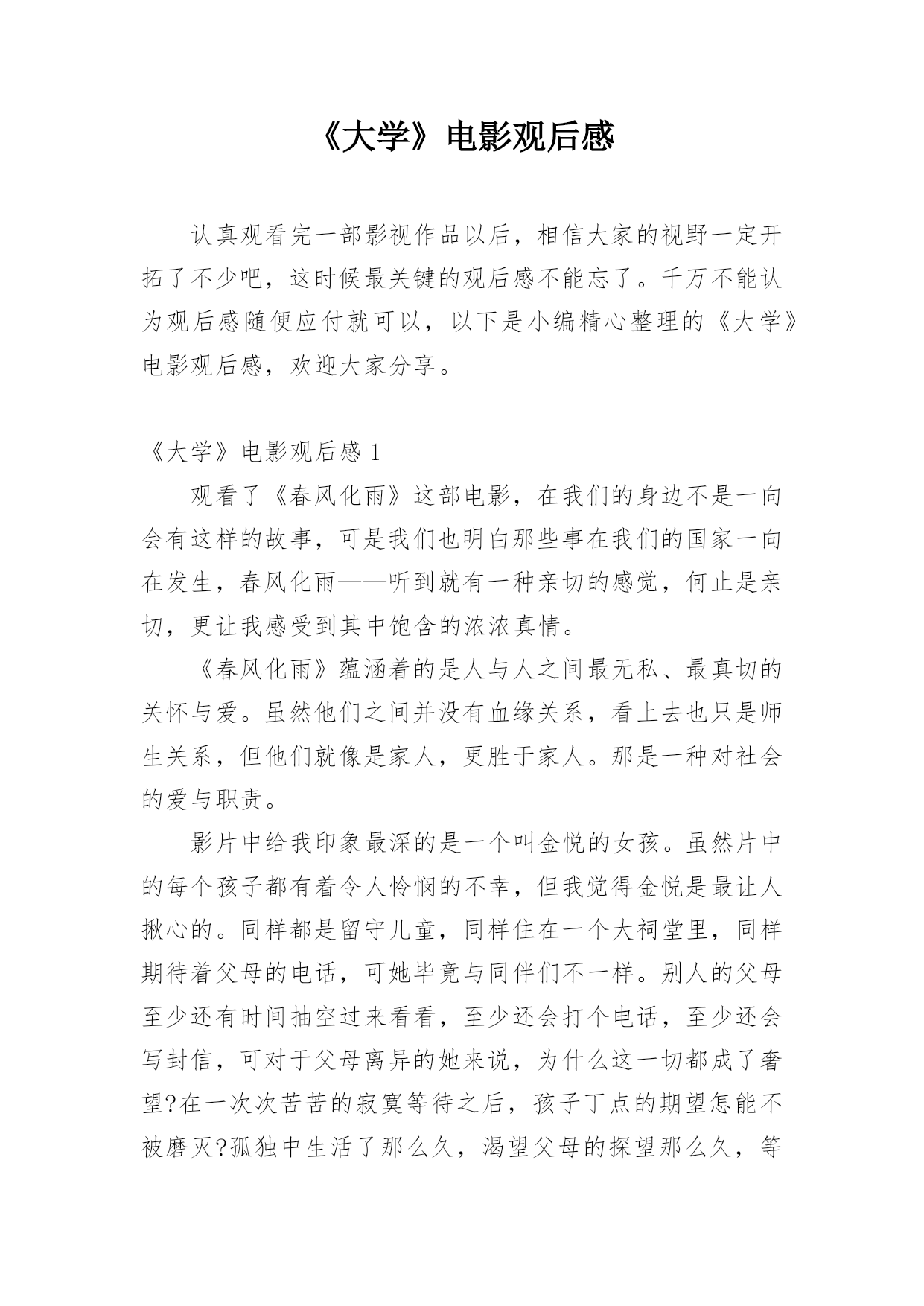 《大学》电影观后感认真观看完一部影视作品以后,相信大家的视野一定开拓了不少吧,这时候最关键的观后感不能忘了。千万不能认为观后感随便应付就可以,以下是小编精心整理的《大学》电影观后感,欢迎大家分享。《大学》电影观后感1观看了《春风化雨》这部电影,在我们的身边不是一向会有这样的故事,可是我们也明白那些事在我们的国家一向在发生,春风化雨——听到就有一种亲切的感觉,何止是亲切,更让我感受到其中饱含的浓浓真情。《春风化雨》蕴涵着的是人与人之间最无私、最真切的关怀与爱。虽然他们之间并没有血缘关系,看上去也只是师生关系