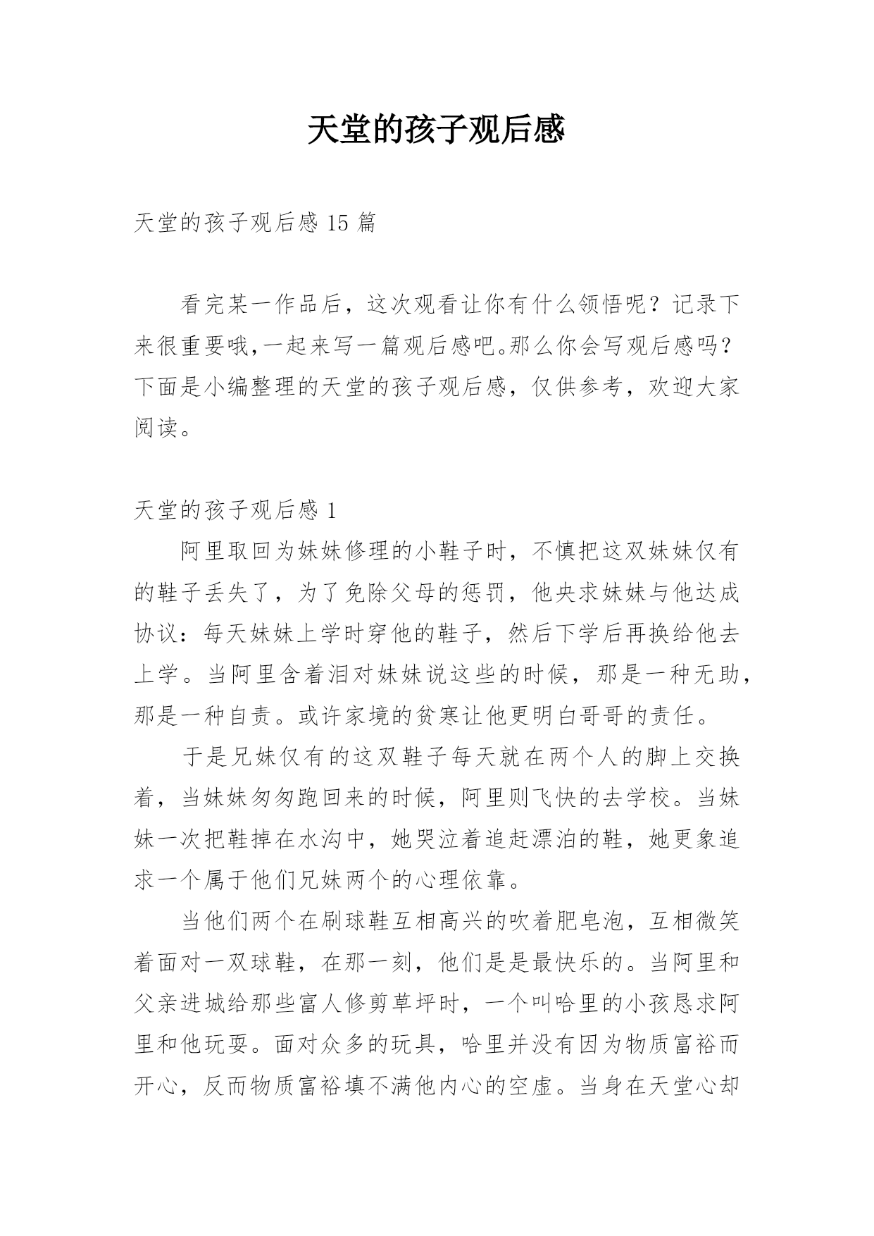 天堂的孩子观后感天堂的孩子观后感15篇看完某一作品后,这次观看让你有什么领悟呢?记录下来很重要哦,一起来写一篇观后感吧。那么你会写观后感吗?下面是小编整理的天堂的孩子观后感,仅供参考,欢迎大家阅读。天堂的孩子观后感1阿里取回为妹妹修理的小鞋子时,不慎把这双妹妹仅有的鞋子丢失了,为了免除父母的惩罚,他央求妹妹与他达成协议:每天妹妹上学时穿他的鞋子,然后下学后再换给他去上学。当阿里含着泪对妹妹说这些的时候,那是一种无助,那是一种自责。或许家境的贫寒让他更明白哥哥的责任。于是兄妹仅有的这双鞋子每天就在两个人的脚