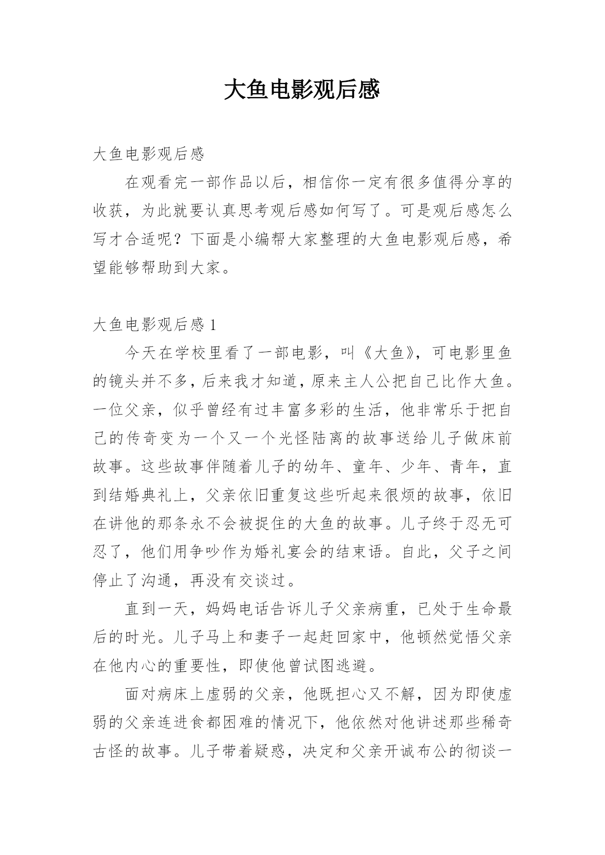 大鱼电影观后感大鱼电影观后感在观看完一部作品以后,相信你一定有很多值得分享的收获,为此就要认真思考观后感如何写了。可是观后感怎么写才合适呢?下面是小编帮大家整理的大鱼电影观后感,希望能够帮助到大家。大鱼电影观后感1今天在学校里看了一部电影,叫《大鱼》,可电影里鱼的镜头并不多,后来我才知道,原来主人公把自己比作大鱼。一位父亲,似乎曾经有过丰富多彩的生活,他非常乐于把自己的传奇变为一个又一个光怪陆离的故事送给儿子做床前故事。这些故事伴随着儿子的幼年、童年、少年、青年,直到结婚典礼上,父亲依旧重复这些听起来很烦